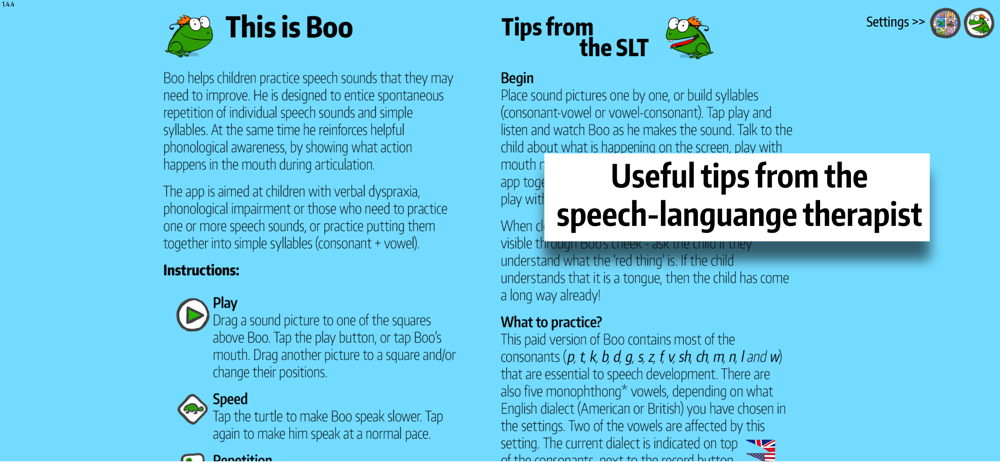 You can record and playback your own sound production for comparison. You can also make Boo go slow, repeat successively, or articulate sound noiselessly. Behind a parental gate you can disable or enable sounds as well as read instructions and tips from the SLT.