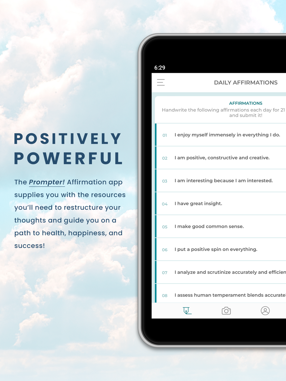 We often think that success creates a positive mindset, but that’s backwards: our thoughts dictate our actions. If you constantly think that, for example, you’re average, you are rehearsing a pattern of thought that will perpetuate in your behavior. We have the solution to this feedback loop: The Prompter affirmation platform. We supply the resources you need to restructure your thoughts and guide you on a path to health, happiness, and success. We provide you with a unique set of affirmations every 21-days that you are to write out by hand and submit daily through the app. When you affirm positive ideas in the present tense with deliberate intentions, you are building new mental habits.With enough rehearsal, these affirmations will become reflexes. Hereafter, you will have no doubt that you are organized because you’ll have rehearsed the idea that “I am very organized in everything I do.” That’s the power of affirmations.
