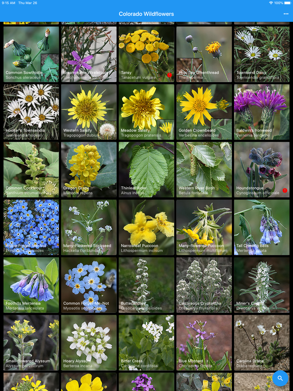 Colorado Wildflowers is a field guide to 674 of the most common flowers found in Colorado. Search using photo recognition or by flower color, time of bloom and location.