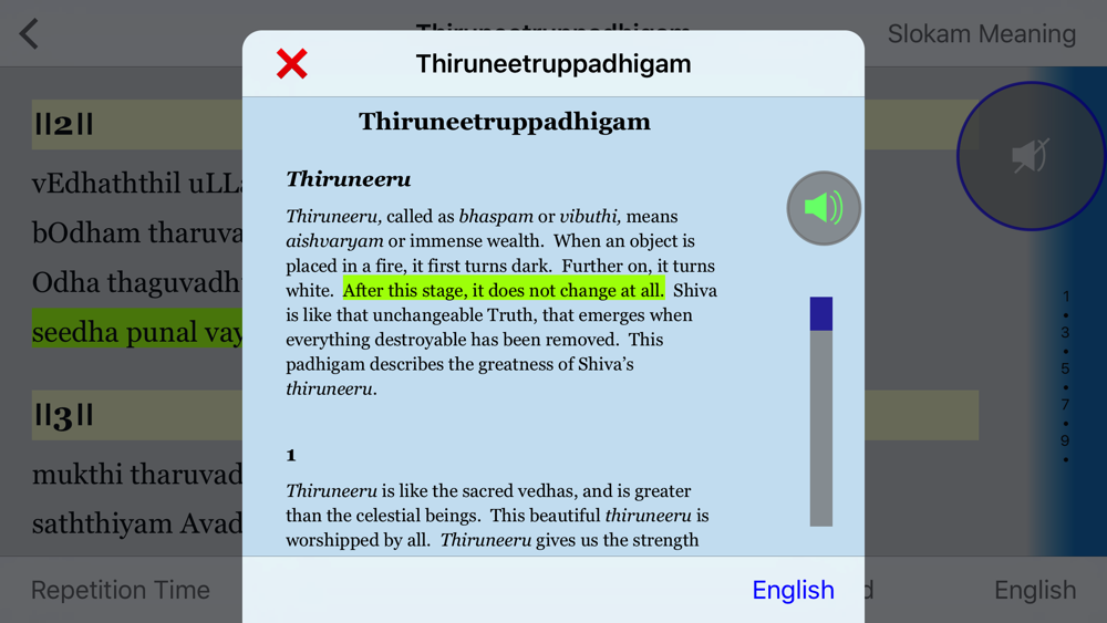 Our slokam audio is designed to help the User in correct diction and pronunciation. The tune, with no instruments, makes the slokam recitation easier.