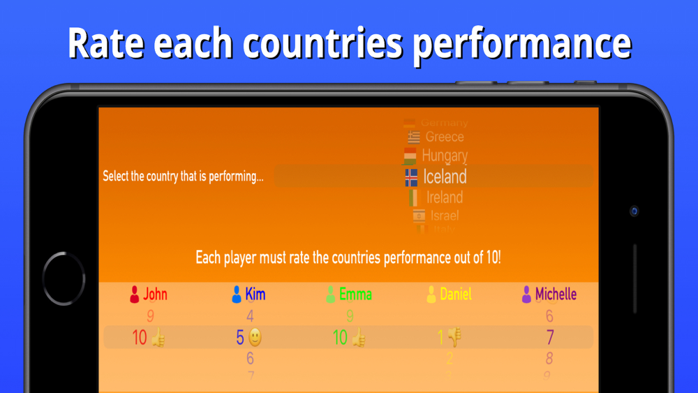 Each person can rate every act from 0-10 as they perform. All of the individual scores are combined to give each country a total score from your group of friends and family. As countries are added to the scoreboard, you will get a clear picture of which countries have earned your family's/friends' 12, 10, and 8 points!