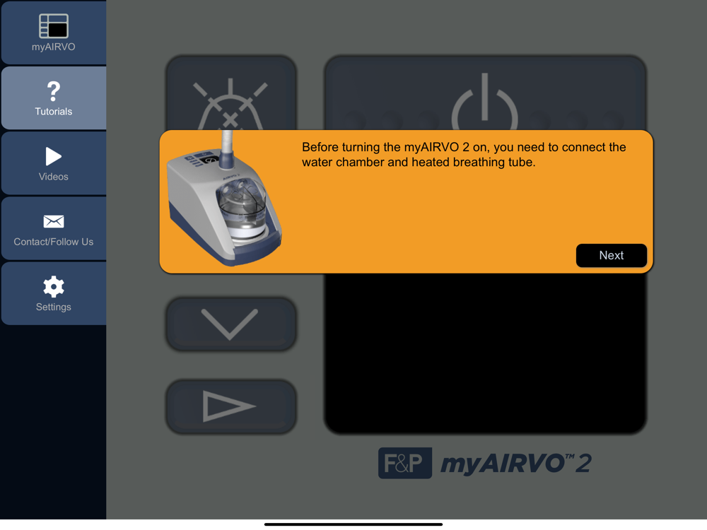 You can change settings, change oxygen levels and simulate warnings. There are tutorials to help out with the basics, as well as short videos clips that step you through operation of the myAIRVO 2.