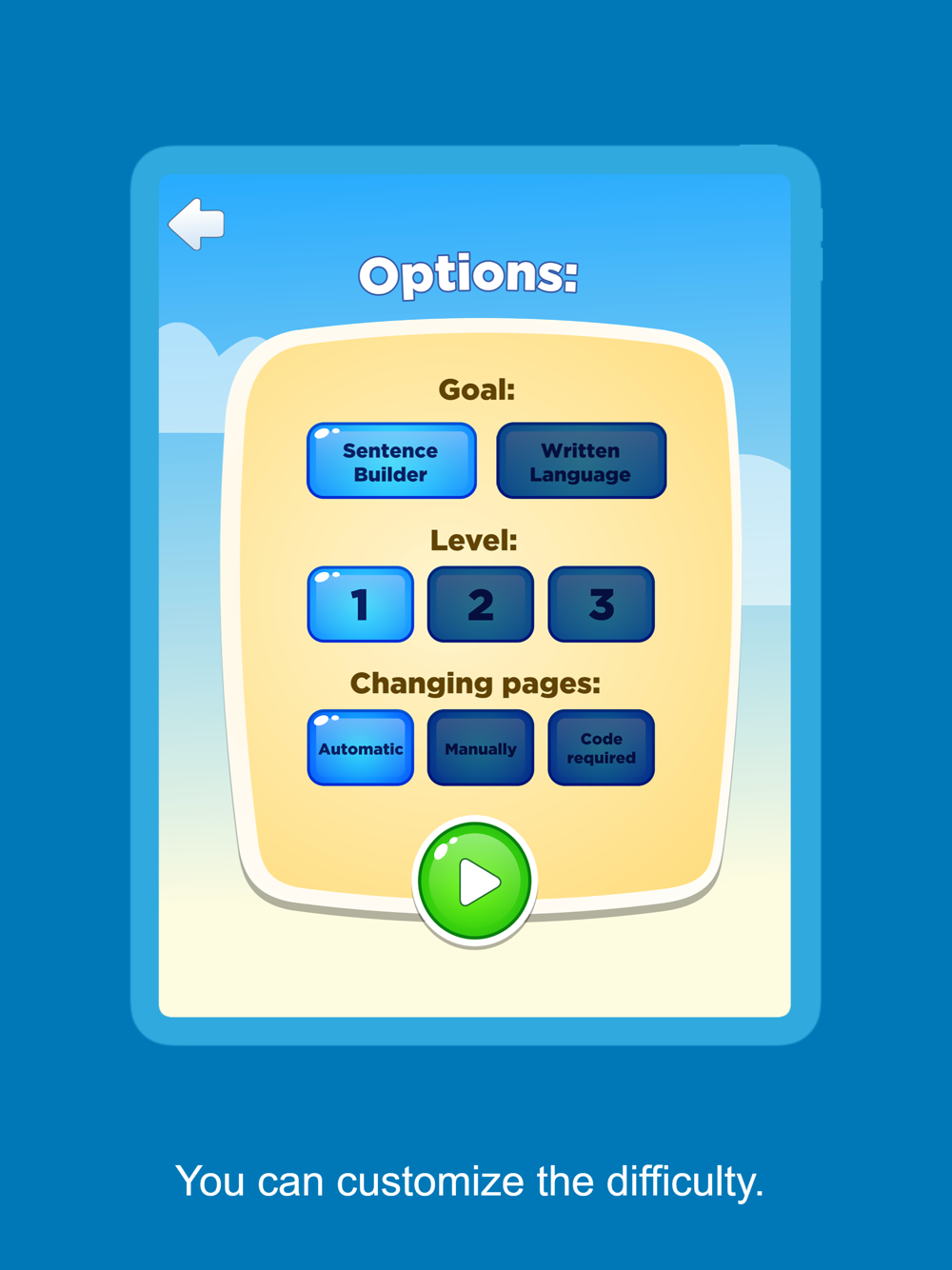 Our app enables the learning of simple sentence structure through games and help build vocabulary. Created by a speech therapist to stimulate language development and acquire base vocabulary, the app also opens the door to the love of reading and writing using pictograms.