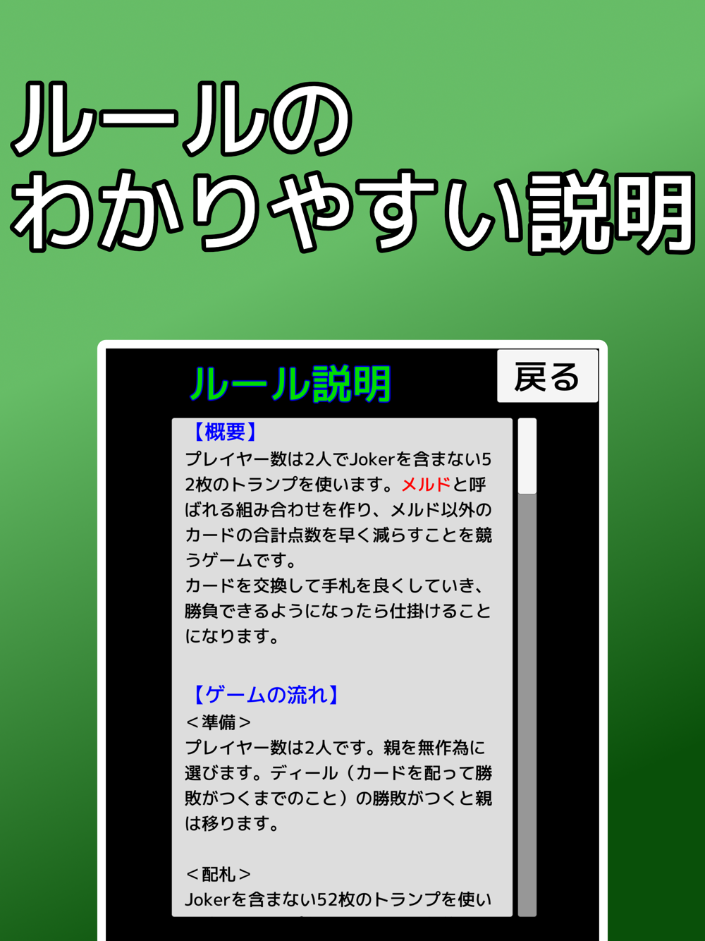 It is an application that you can play the card game "Gin Rummy". Gin Rummy is a world-famous game that originated in the United States and is one of the three major card games in the world. It is fun that can be said to be the definitive version of the game played by two people.
