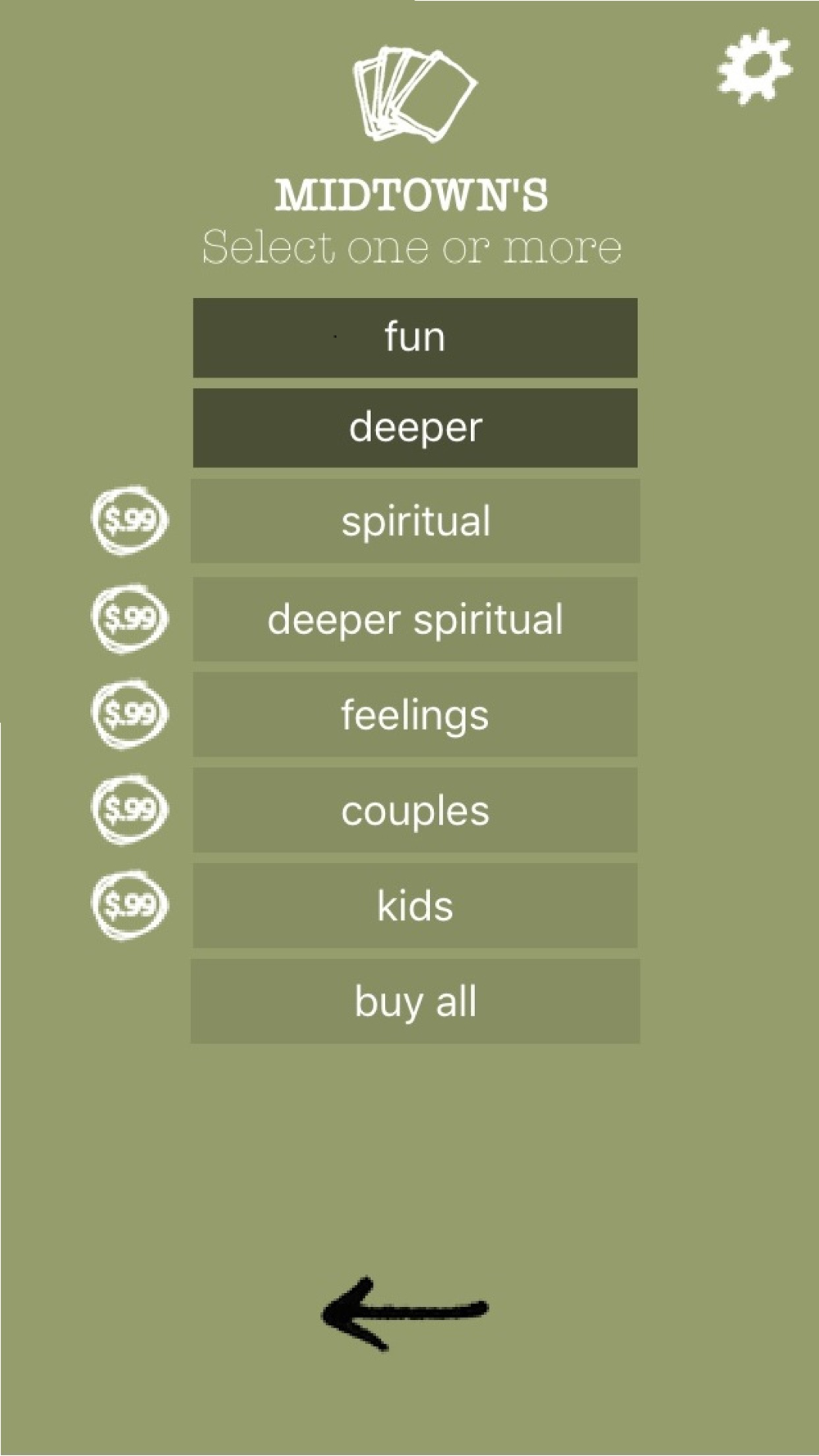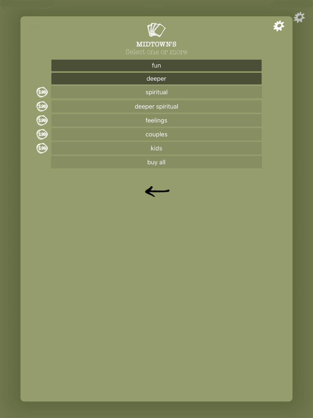 Enjoy the ability to customize your virtual deck of cards by using the settings wheel at the top right-hand corner of the screen to select one or more categories of questions. Use the settings wheel again to change the Custom Title, select a Theme (traditional, earthy or bold), and choose a Custom Font size (small is recommended for iPhone 5s®, large is recommended for iPads, and medium for all other Apple devices.) Default font size is medium.
