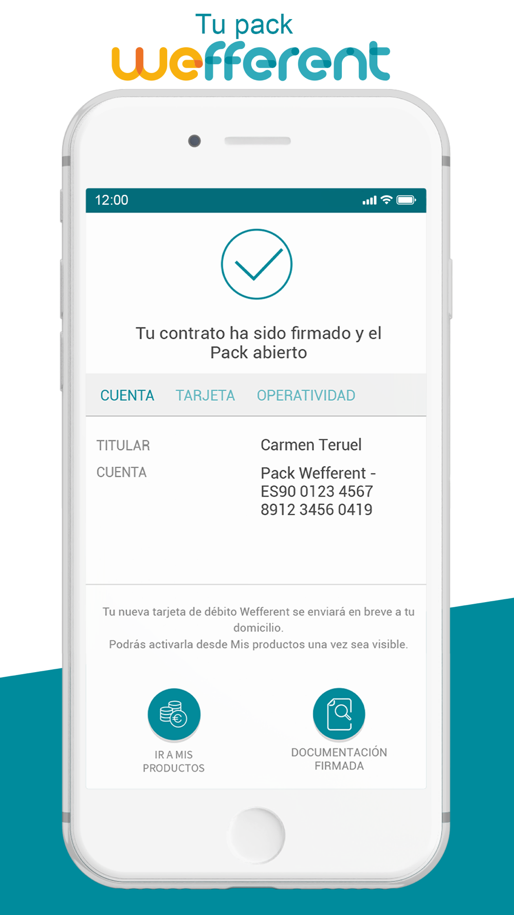 - Tu pack Wefferent a mano las 24 horas, sin colas, sin esperas... Gestiona tus movimientos en cualquier lugar. Envía dinero, cómo y cuándo quieras. Apaga y enciende tus tarjetas a voluntad, modifica sus límites, cambia dónde y cómo las puedas utilizar en momentos, sin trámites.