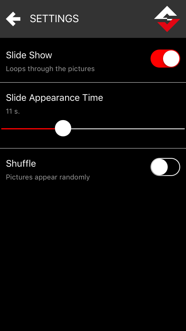 The application has an easy and intuitive layout. Changing images is done by simply tapping the screen. To bring the navigation menu onto the screen, slide from the left edge of your device towards its opposite edge. Dismiss it by tapping away. Application settings let you set up a slide show, where images can be shuffled and displayed for a desired time.