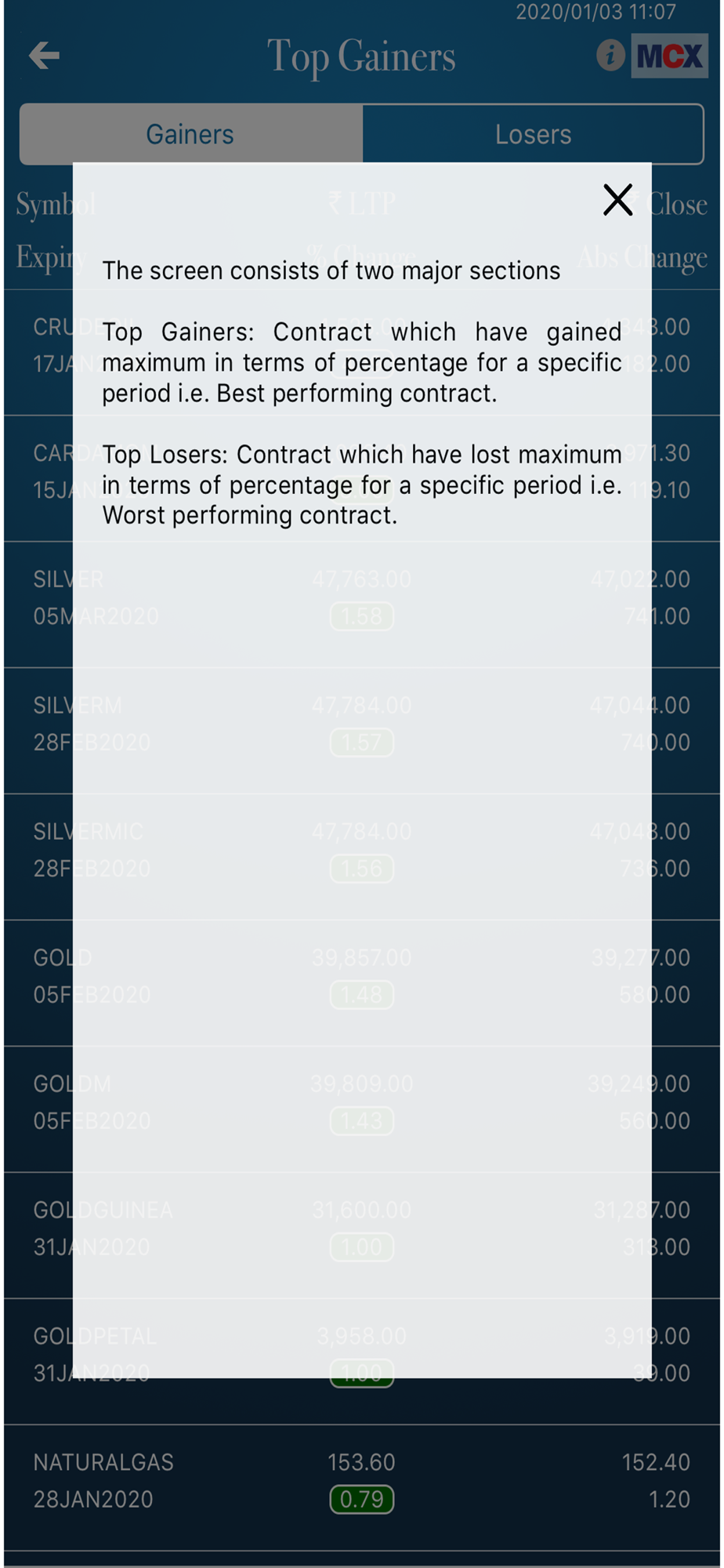 The MCX App. displays certain features like- Market Data, Top Gainers & Losers, Graph, Get Quote etc., to track the commodity movements.