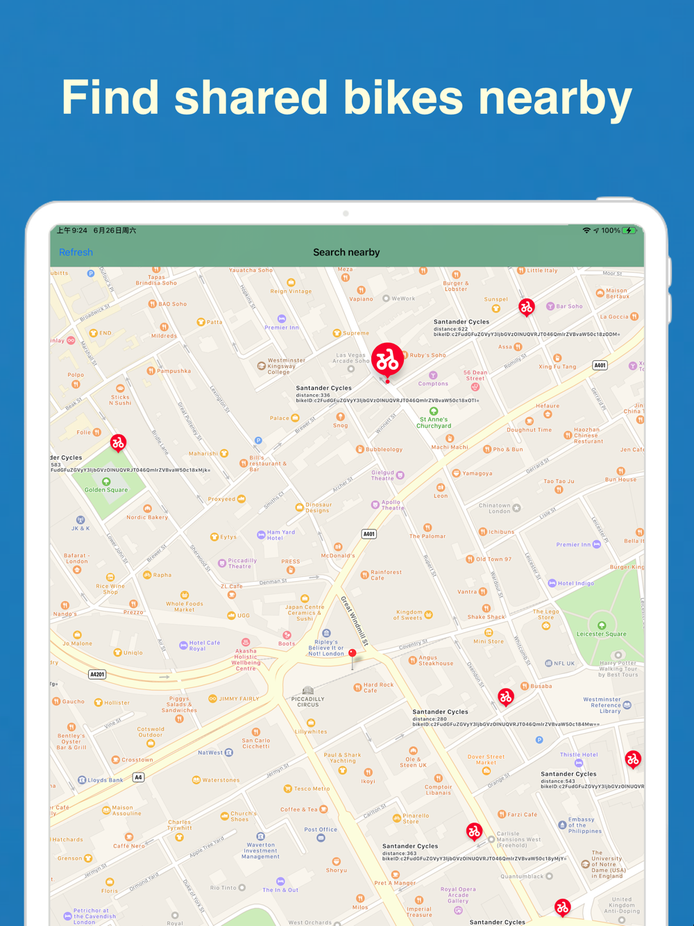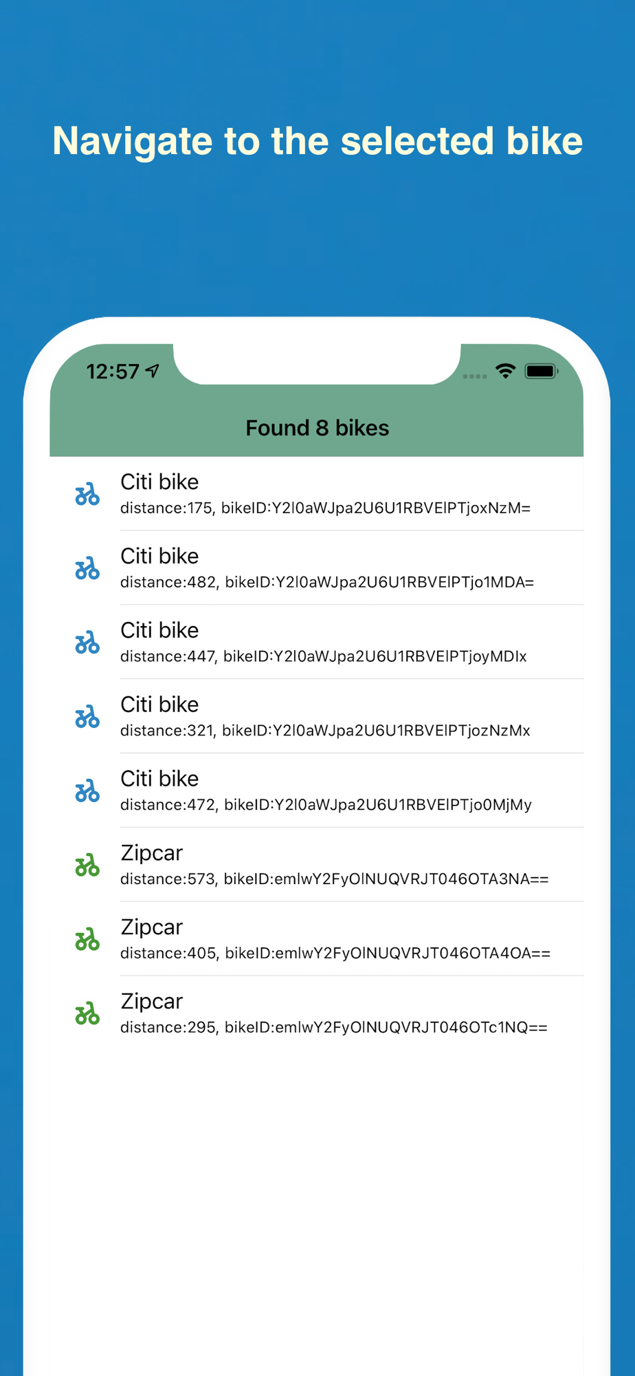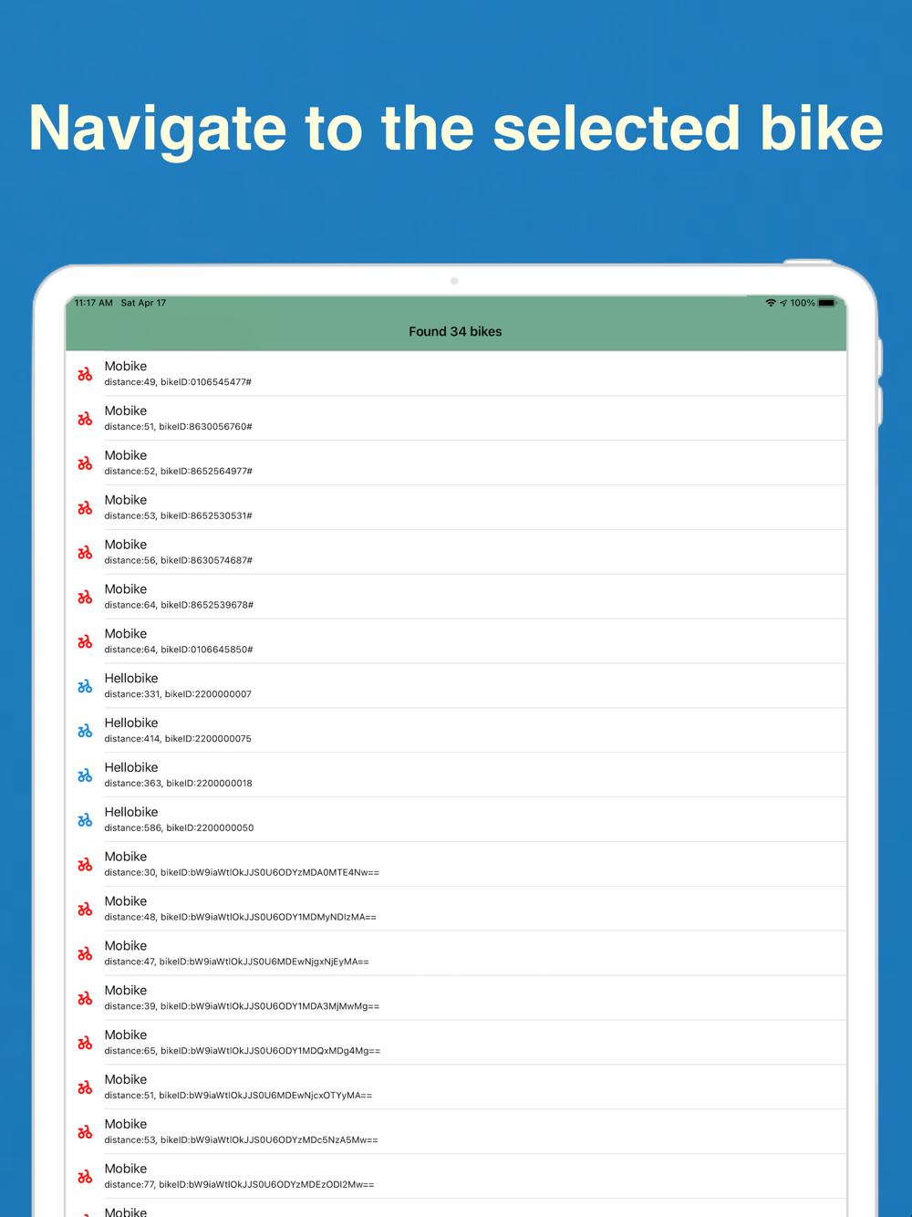 * Navigate to the location of the selected bike by build-in Apple map, Google map, Baidu map, or Autonav.