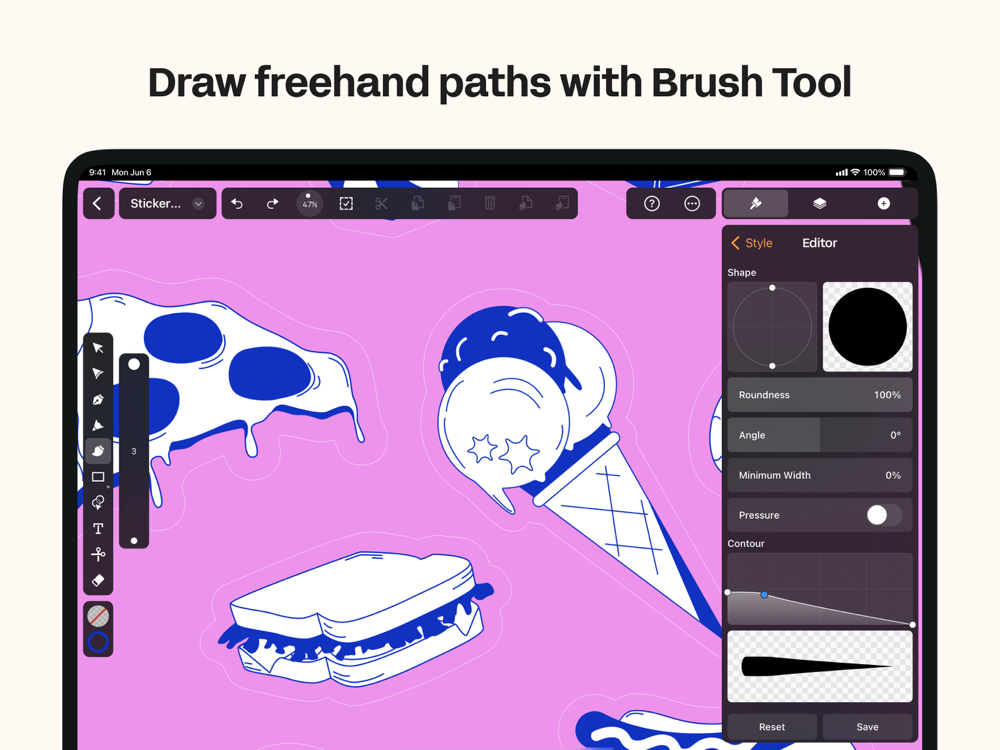- Paint fluid vector shapes with our pressure-sensitive, fully customizable Brush Tool.