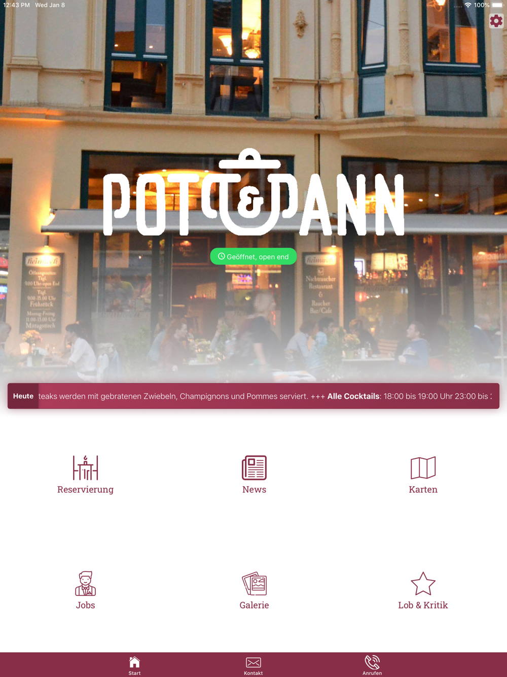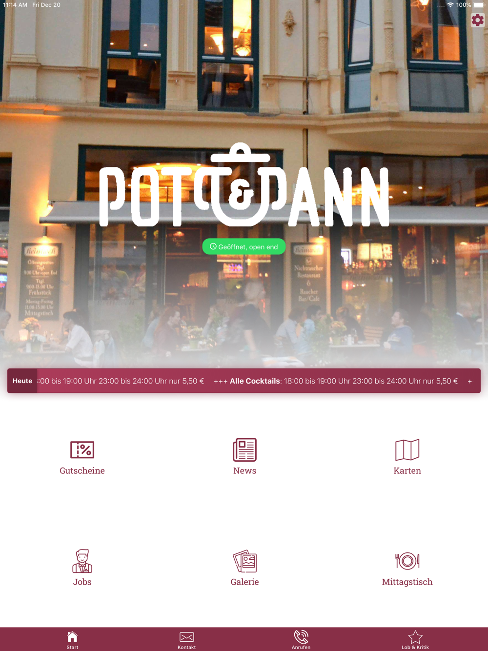 Das pott und pann Bremen hat im Winter 2019 das Licht der Welt erblickt. Lade dir unsere neue App herunter und sei der Erste der über unsere Wochenkarte informiert wird. Natürlich kannst du über unsere App auch einen Tisch reservieren oder direkt einen Wertgutschein kaufen. Wir sehen uns im Bremer Viertel.