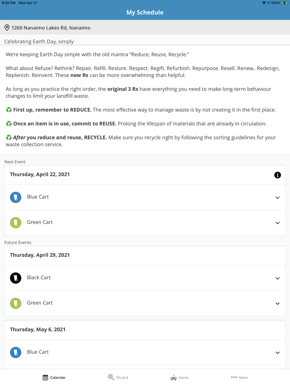 Garbage and recycling schedules and reminders for City of Nanaimo. View your garbage and recycling schedule and receive collection notifications all from within this app.