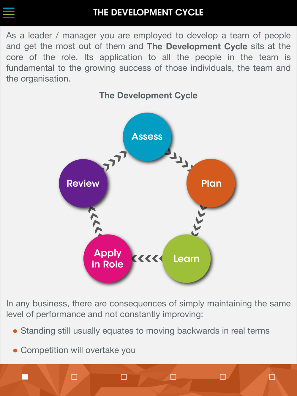 The Management Excellence App takes you through every aspect of Management, from what the role involves developing your team members, including managing their performance and ensuring any necessary change is implemented. Some of the items covered are;
