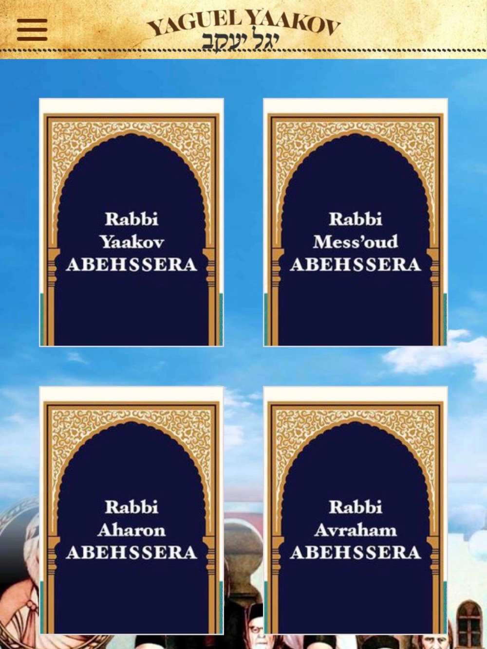 L'application Yaguel Yaakov est heureuse de vous présenter ici son application dédié aux maitres de la tradition Abehsesera avec les oeuvres completes de Rabbi Yaakov le Avir Yakov, le Yaguel Yaakov.