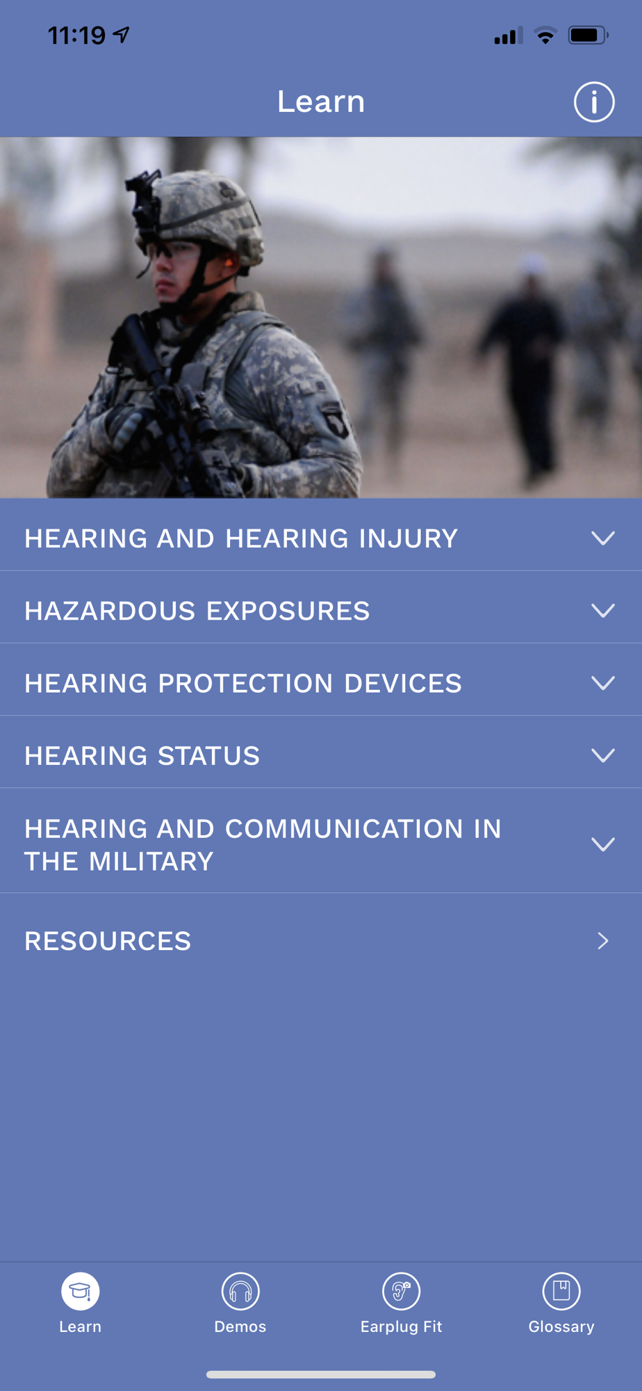 An informational tool to help Warfighters take their hearing health into their own hands. The app combines text with contextual demonstrations to provide knowledge and understanding of the dangers of auditory injury and what life could be like if proper precautions are not taken. The Warfighter can experience hearing loss and tinnitus through simulations before a permanent and progressive disability is acquired. When questions arise as to how well hearing protection devices (HPDs) are fitting, the HPD Check feature will allow the Warfighter to compare his/her current fit of HPDs in his/her own ears to examples of good fitting devices.