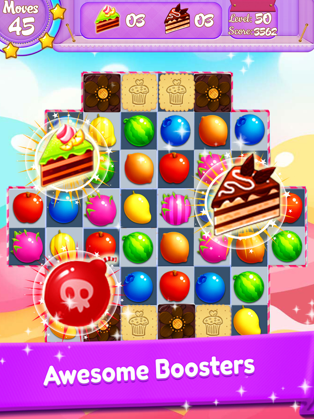 Play this Candy Fruit match 3 game whenever you want, there’s no place you cannot play! In the bathroom, bedroom, living room or outside. Nothing is too crazy for the milk monsters in the candy world. Join them and match candies like never before. Can you taste the sweet ice cream already?
