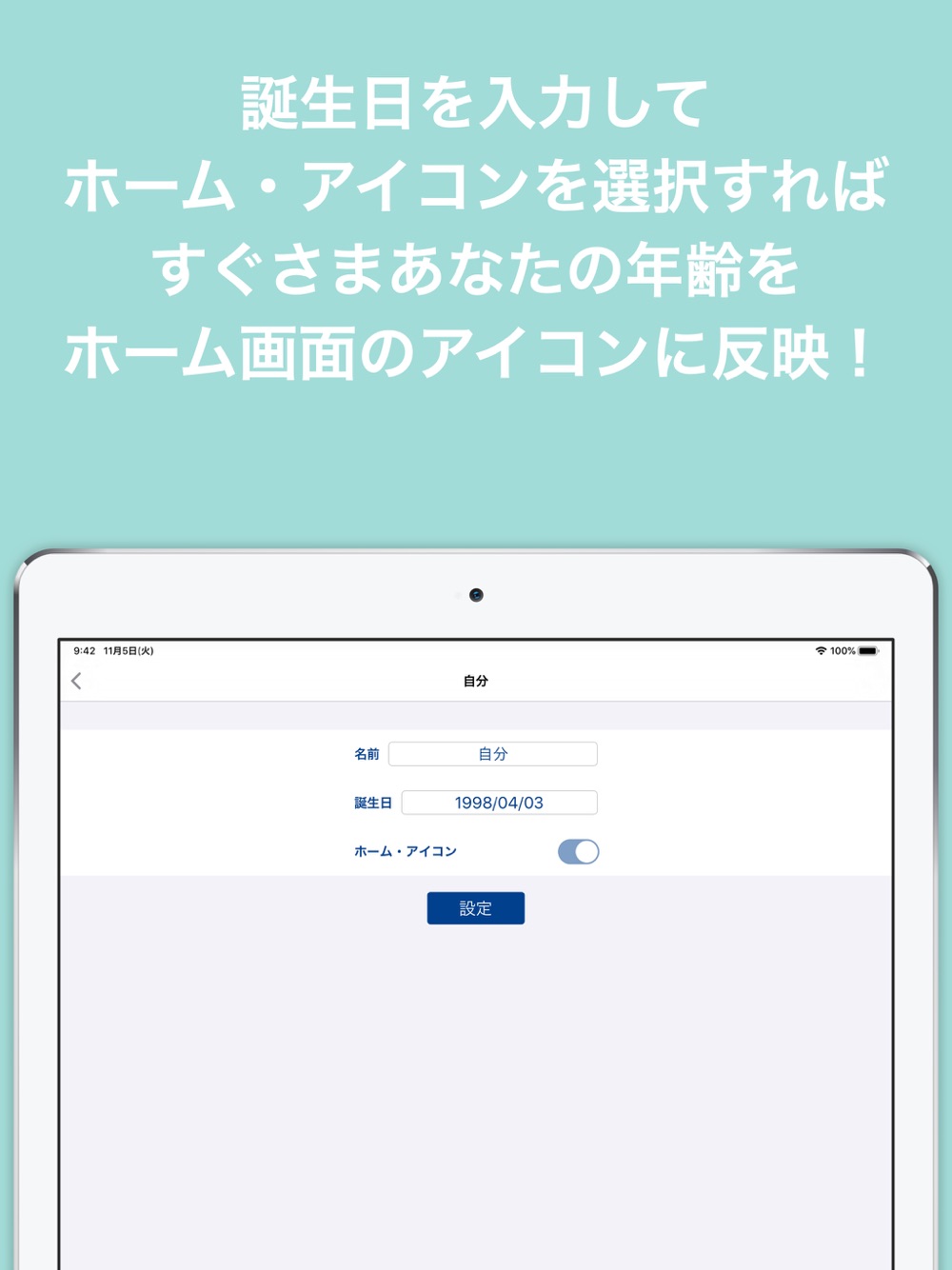 オマケとして、選択した人の現在の年齢をホーム画面にアイコンとして表示する機能も付いています。
