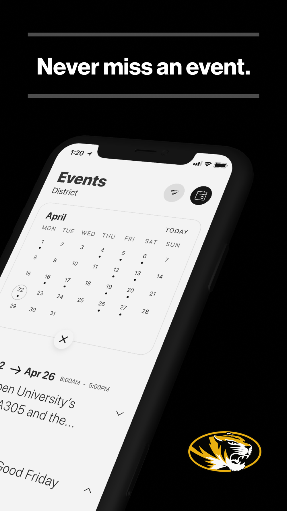 The event section shows a list of events throughout the district. Users can add an event to your calendar to share the event with friends and family with one tap.