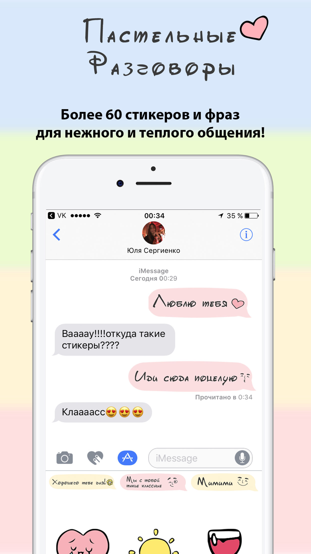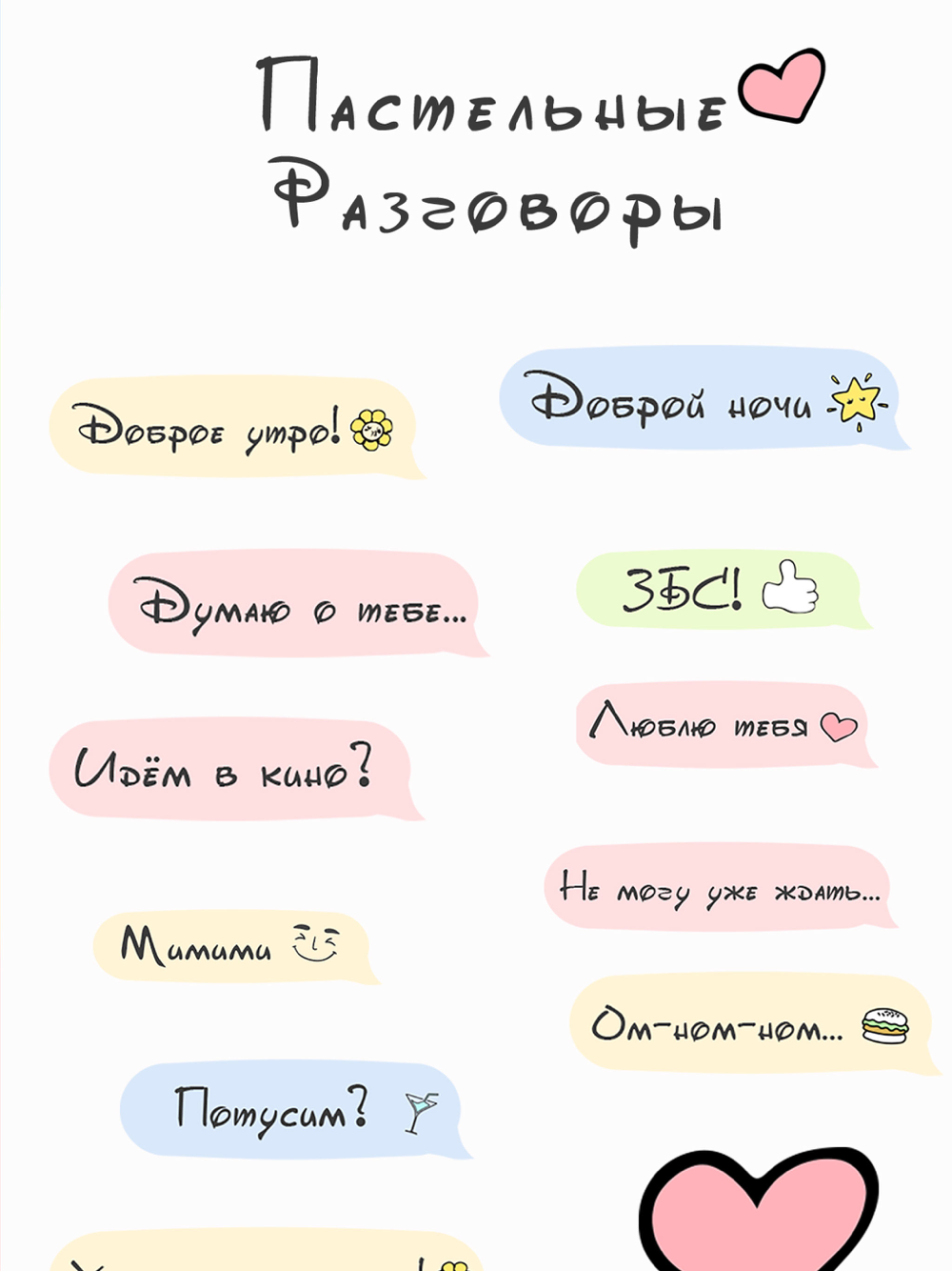 Вот Вам милые цветные стикеры в пастельных тонах! Набор включает в себя 63 фразы и 9 милых смайликов. 63 фразы являются наиболее часто используемыми в повседневной жизни. Вы можете использовать эти стикеры каждый день и в любой особенный момент!
