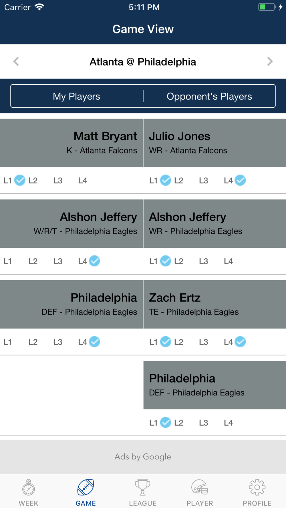 Foremost Fantasy provides users with the ability to see the weekly NFL schedule and how many fantasy players they have for each NFL game. Ex: Chicago vs Dallas…Week View will show that you have 3 players FOR you in that game and 2 players AGAINST you. Drill into the Game View and see the specific players listed, along with which leagues which players are in. No need to look at several different fantasy matchups and attempting to memorize all of them. Those days are over! This is the ultimate fantasy snapshot as you watch NFL games on Sundays! Don’t watch LeVeon Bell score 2 TDs and get excited, and then realize later on that you were going against Bell in 2 leagues as well. Open Game View and see your ENTIRE fantasy landscape by looking at one screen!