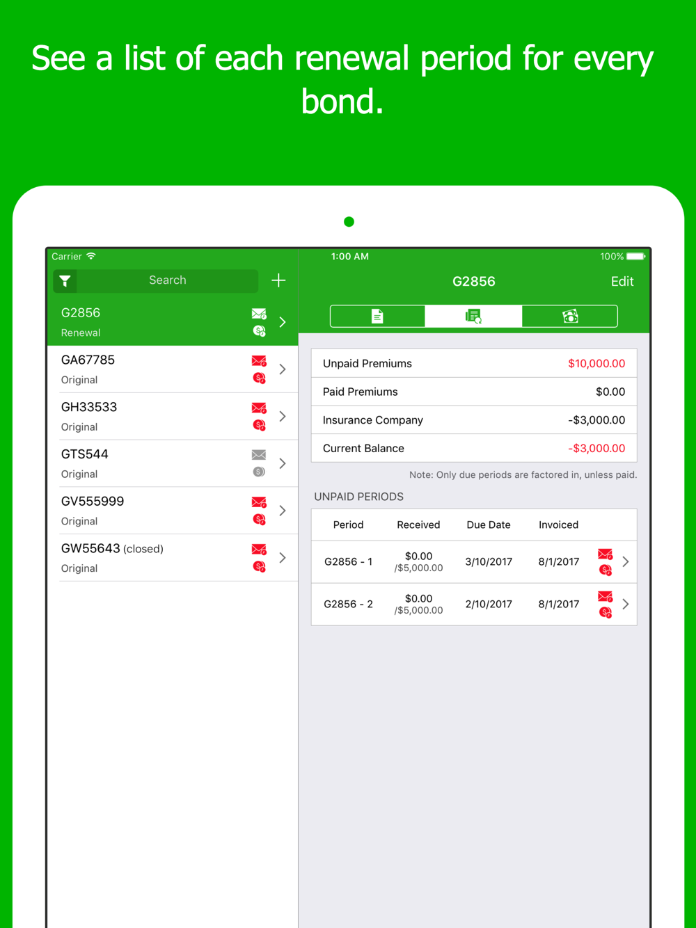 This app is meant for use by surety bond brokers. It was created to track surety bonds for the purpose of generating invoices for insurance premiums and reporting the resulting earnings back to a sponsoring insurance company.