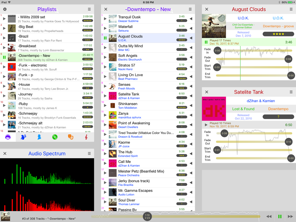 Playlist Lab allows cross-fading between tracks. It has a unique auto-crossfade-time feature that finds quiet sections at the beginning and ending of tracks and brings them together for seamless playback. You can manually adjust the automatic crossfade times. See the loudness-vs-time curve for each track.