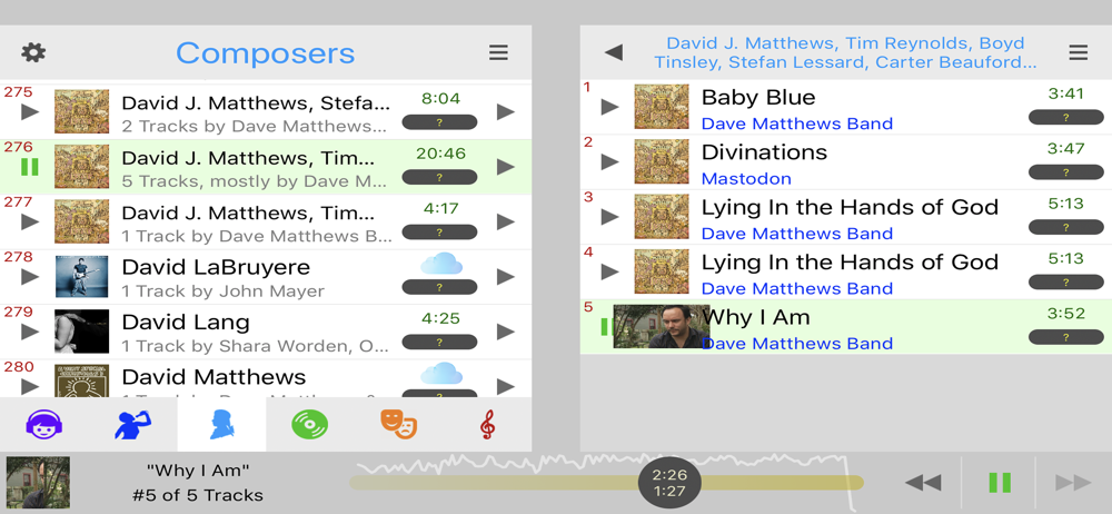 • Display lists of tracks of any artist, composer, or genre, creating playlists from them with a single command.
