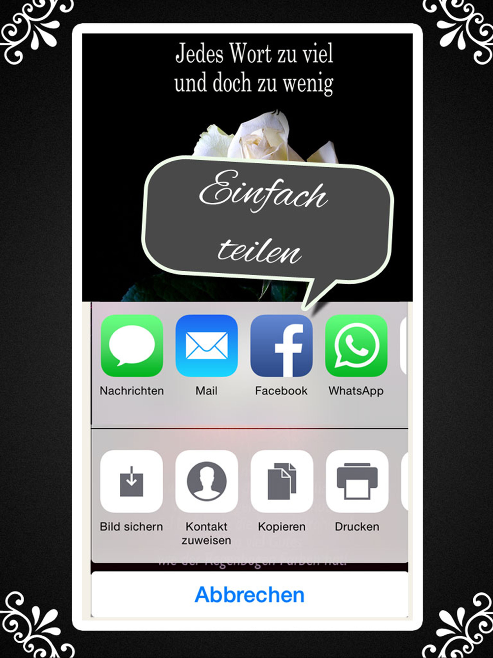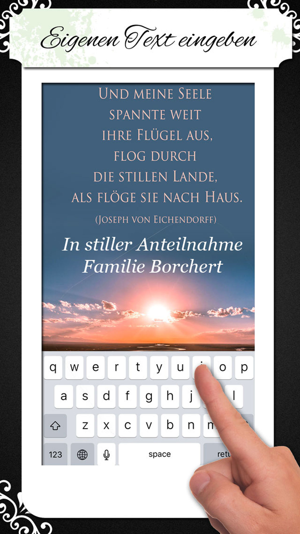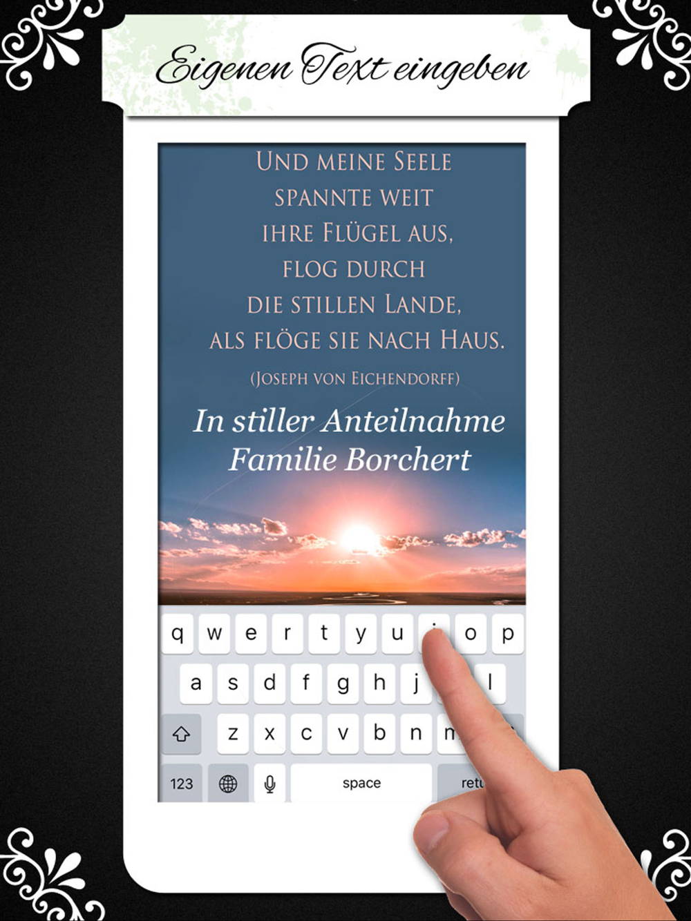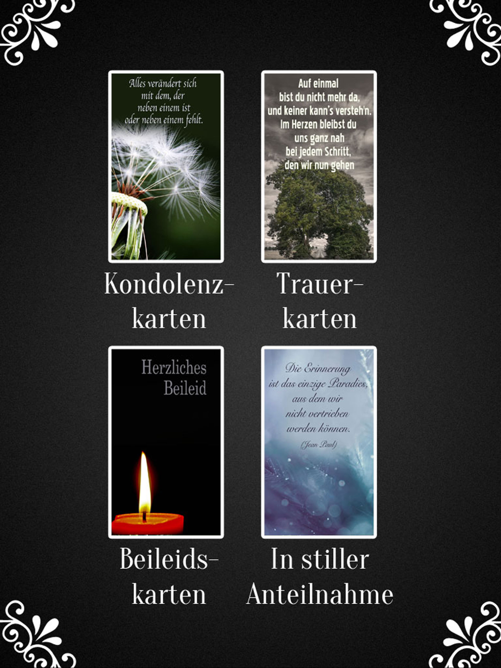 Einfühlsame und stilvolle Beileidskarten, Trauerkarten und Kondolenzkarten zum Verschicken, Teilen und Posten: Mit dieser App können Sie einer trauernden Person Ihr Beileid, Ihre Anteilnahme und Ihr Mitgefühl ausdrücken!