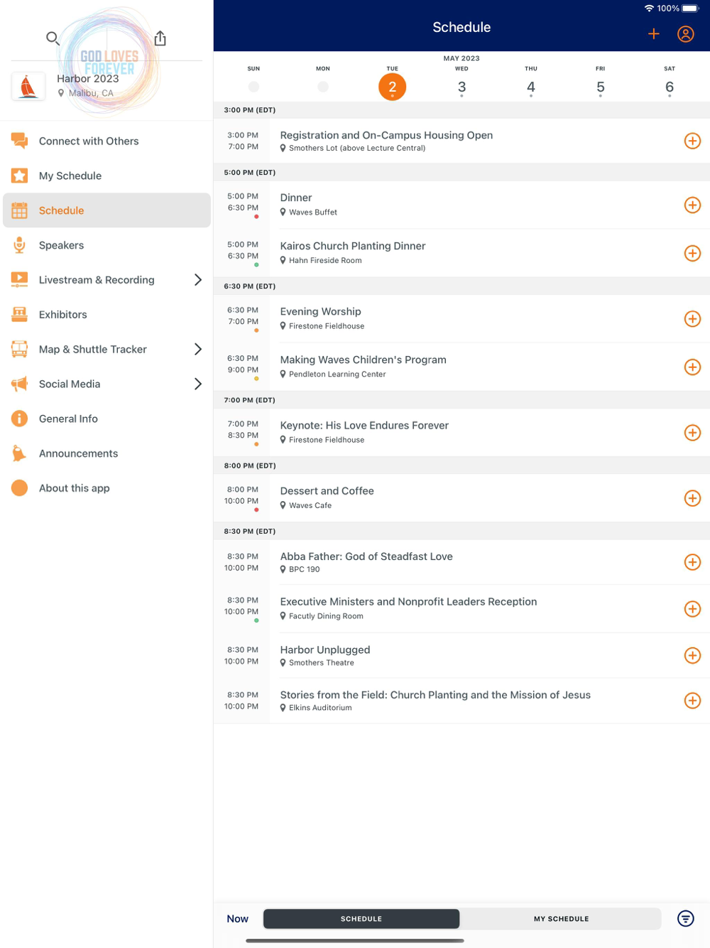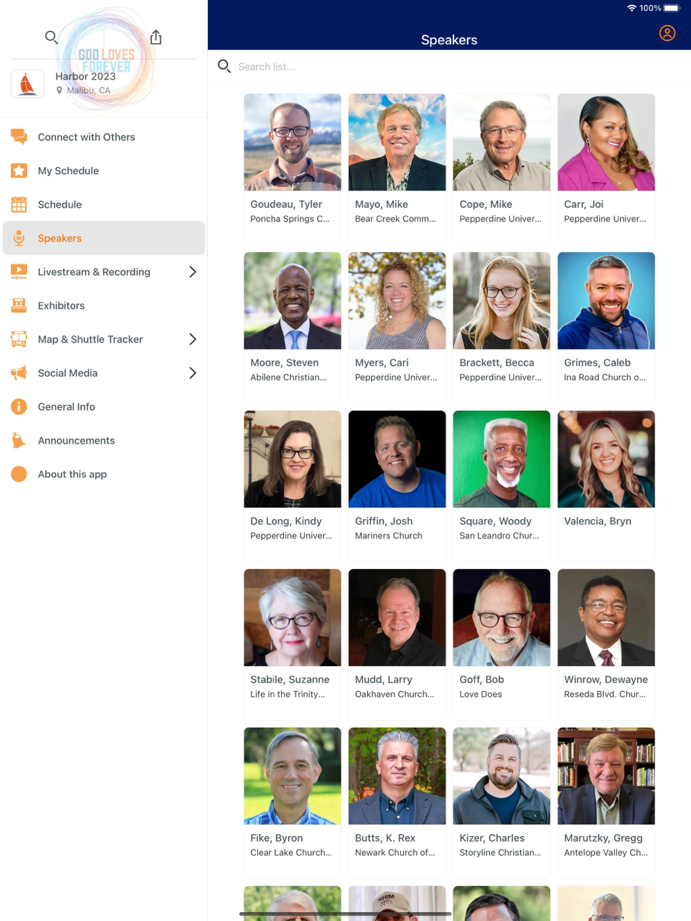 Welcome to Harbor at Pepperdine University! The Harbor mobile app is your one-stop resource for fellowship and learning. Build your schedule directly in the app, check out speaker bios, and connect with fellow attendees.