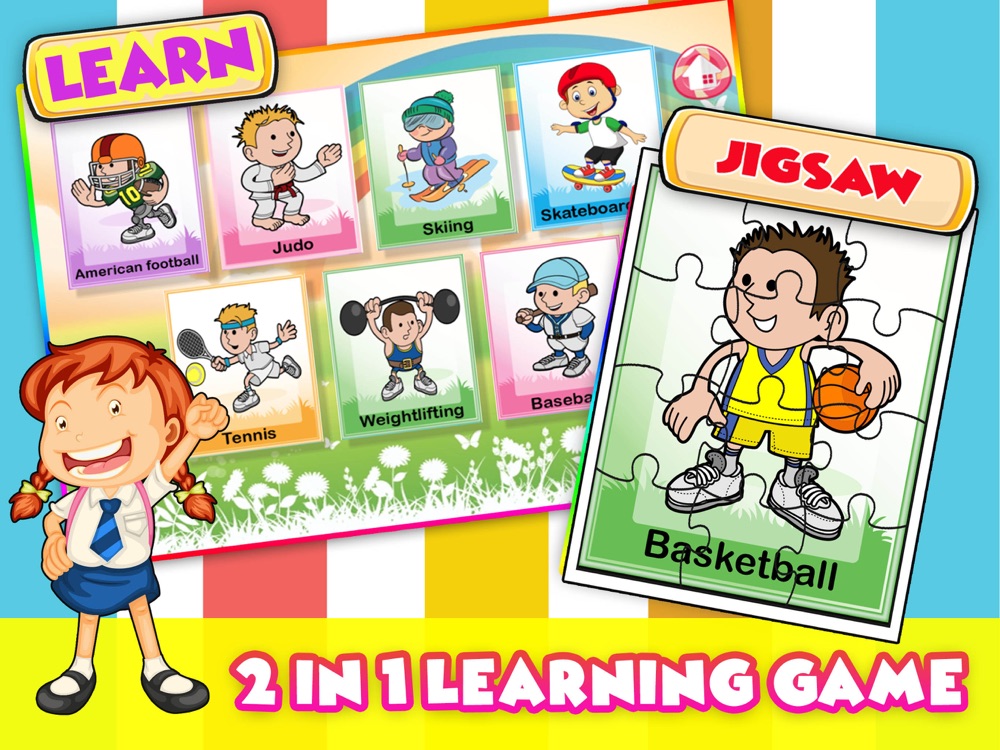 Sports jigsaw puzzle, learn name of sports with flashcards and jigsaw puzzle for preschoolers