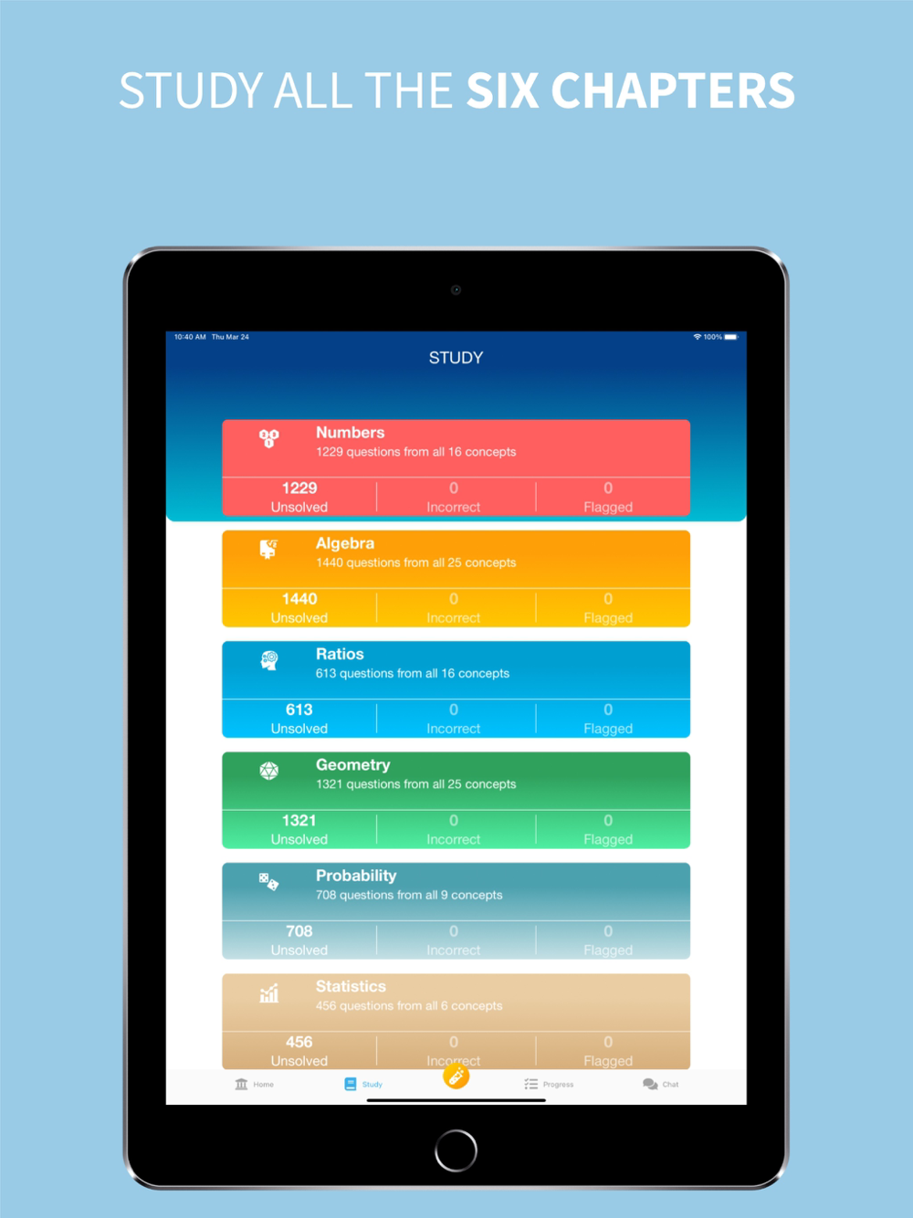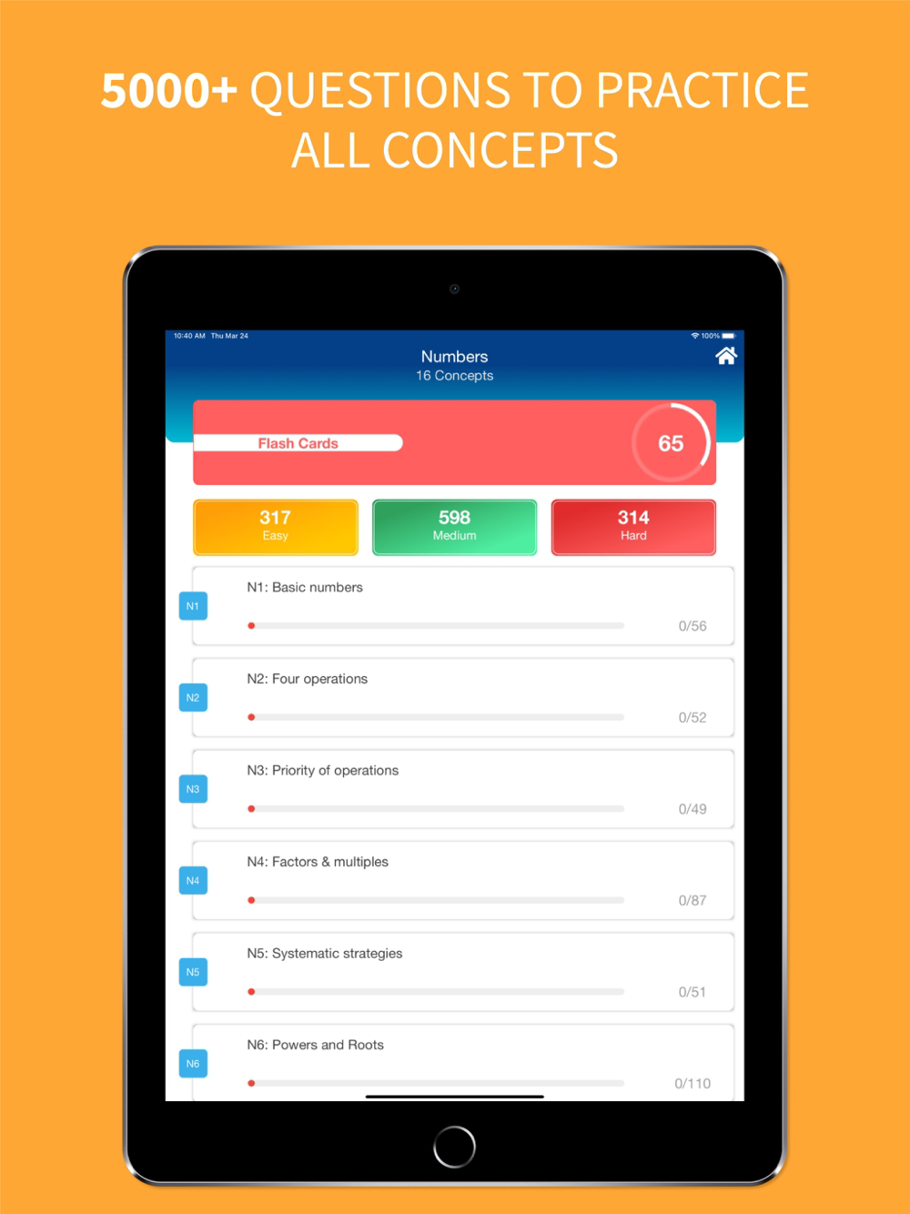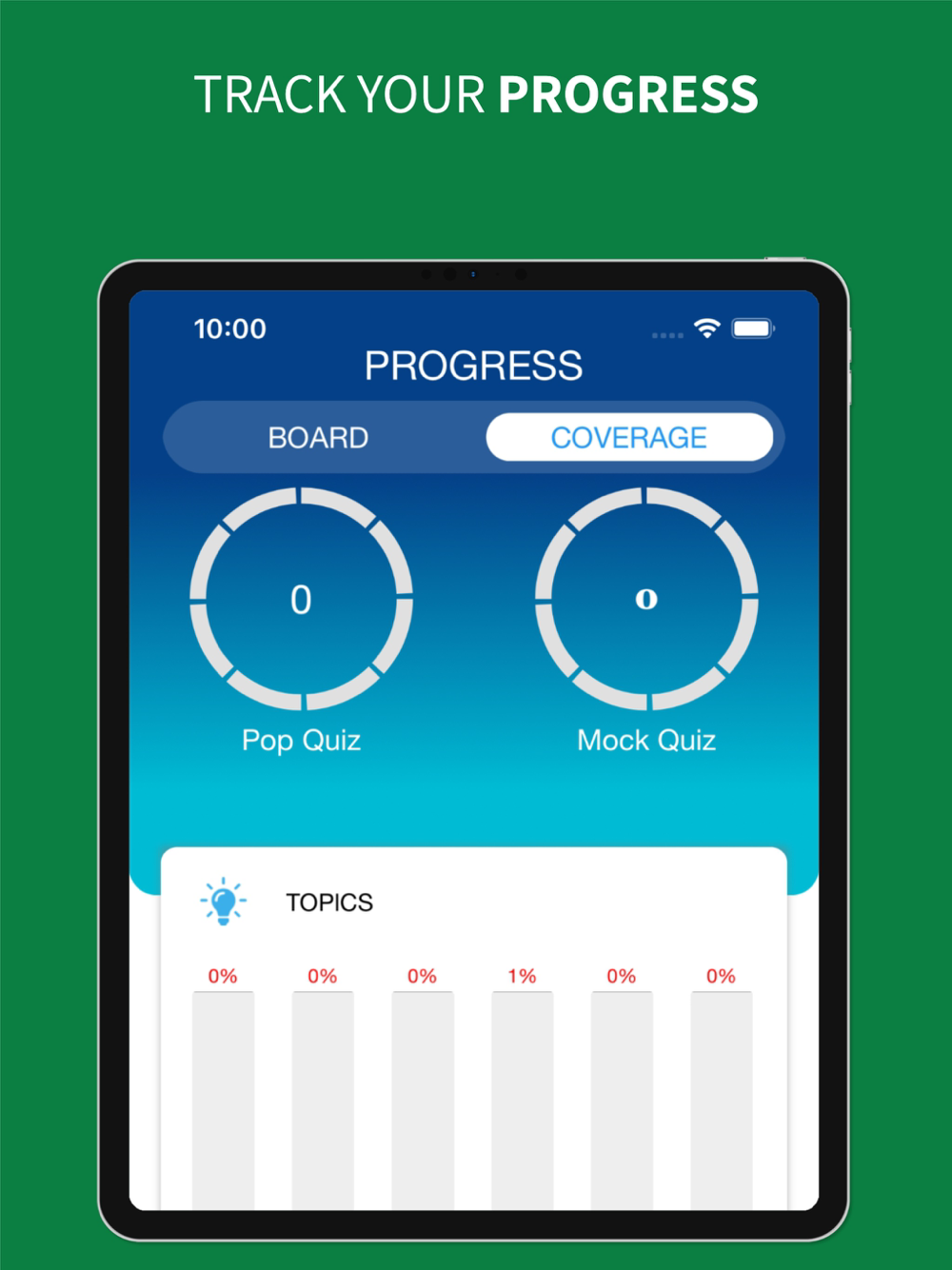 The app also helps you to monitor your progress and scores and shows your improvement by topic so that you can focus more or less on topics as required.