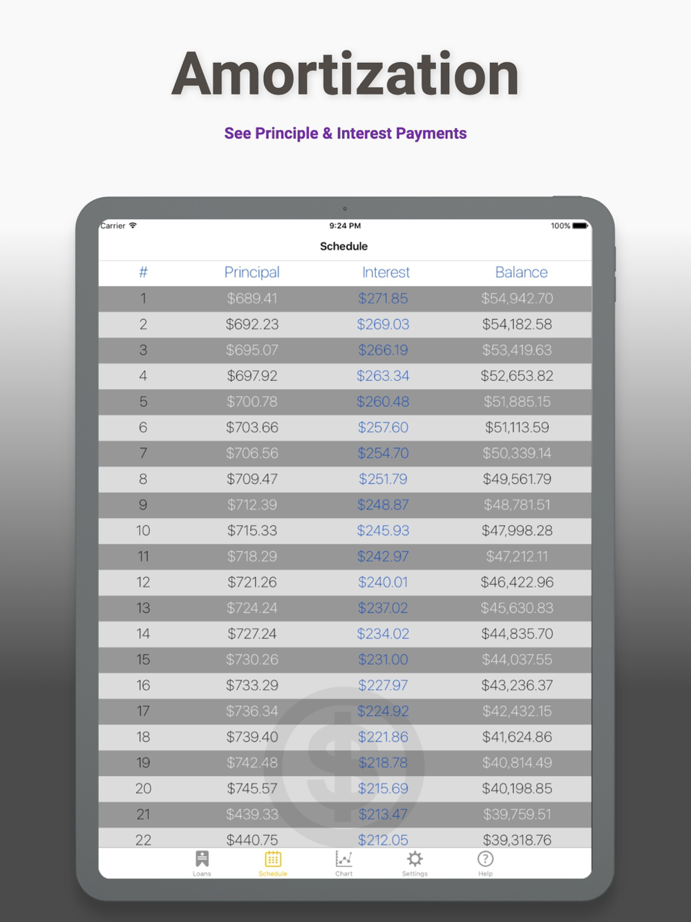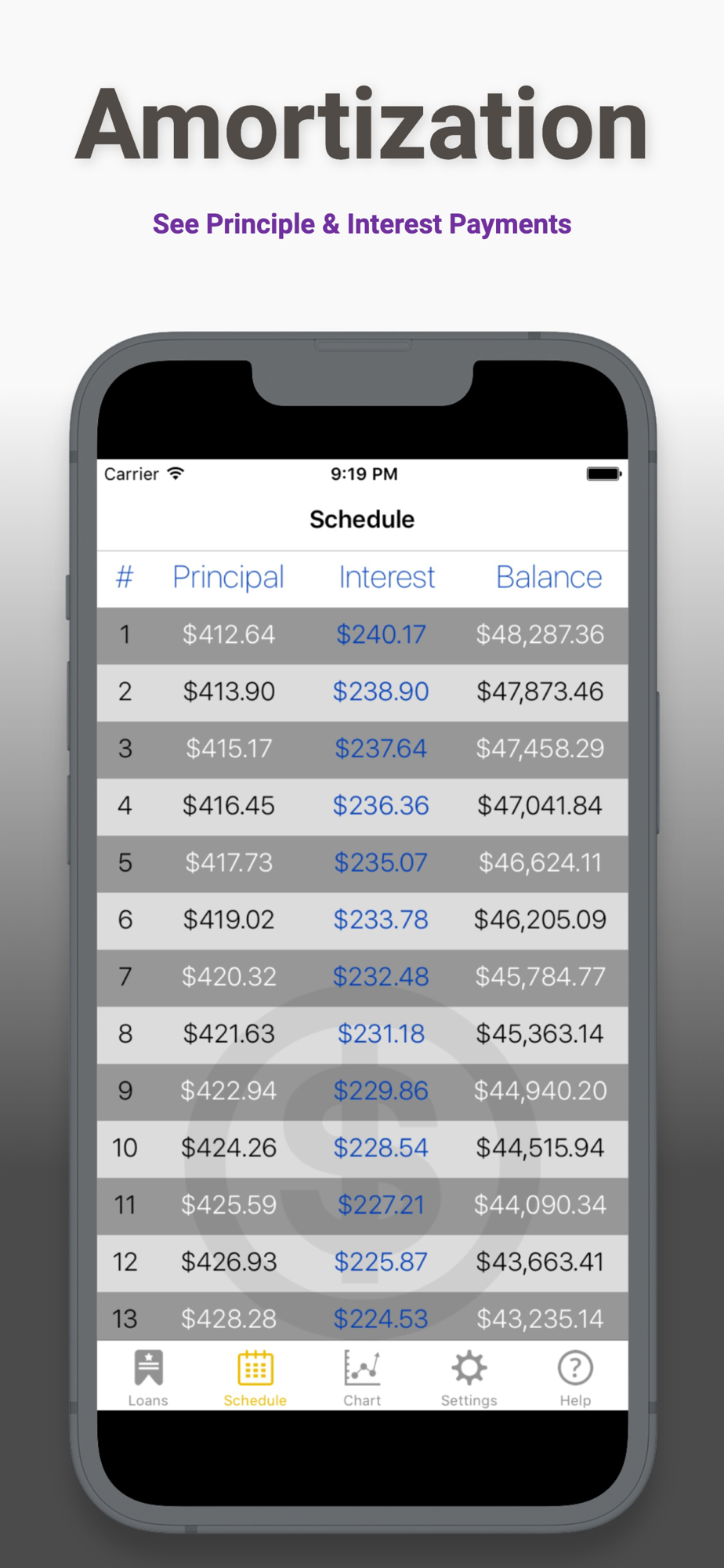 • Break down of payments for each period (amortization).