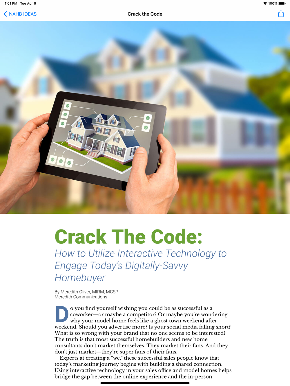 The NAHB IDEAS app bought to you by the National Association of Home Builders (NAHB) provides the housing industry with the latest trends and techniques in new home sales, marketing, business management, research, and trends as well as practical articles to help housing industry professionals grow in their careers. Articles are written by the top experts in the housing industry.