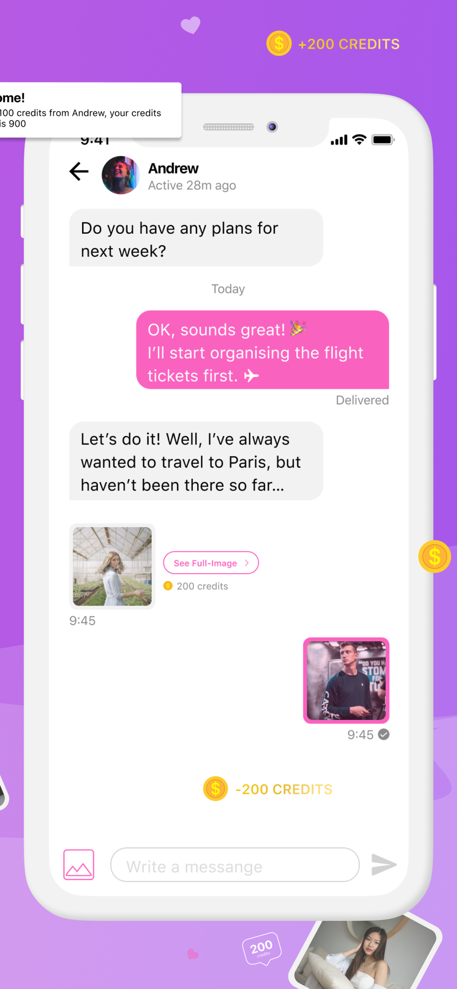 Obtain Credits by interesting mini-tasks! Unlock more convenient friend-making functions. Or Buy In app-purchase, more you buy more discount you get!