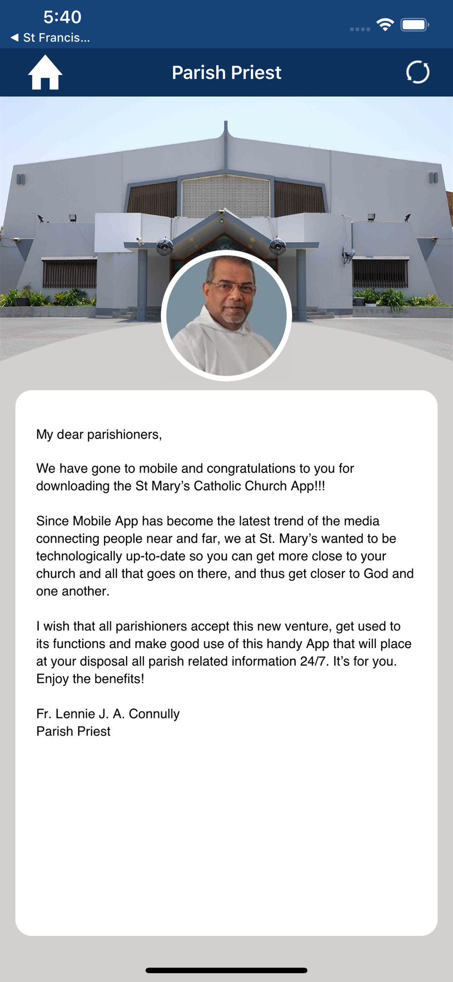 Fr. Lennie J. A. Connully, Parish Priest of St. Mary’s Catholic Church envisioned the ministry through integrating a latest technologies by enabling the mobility info-case of the church. The church members benefit from the following features of this application with dynamic content managed by the parish office and receive the regular updates from the St. Mary’s Catholic Church - Dubai through this application