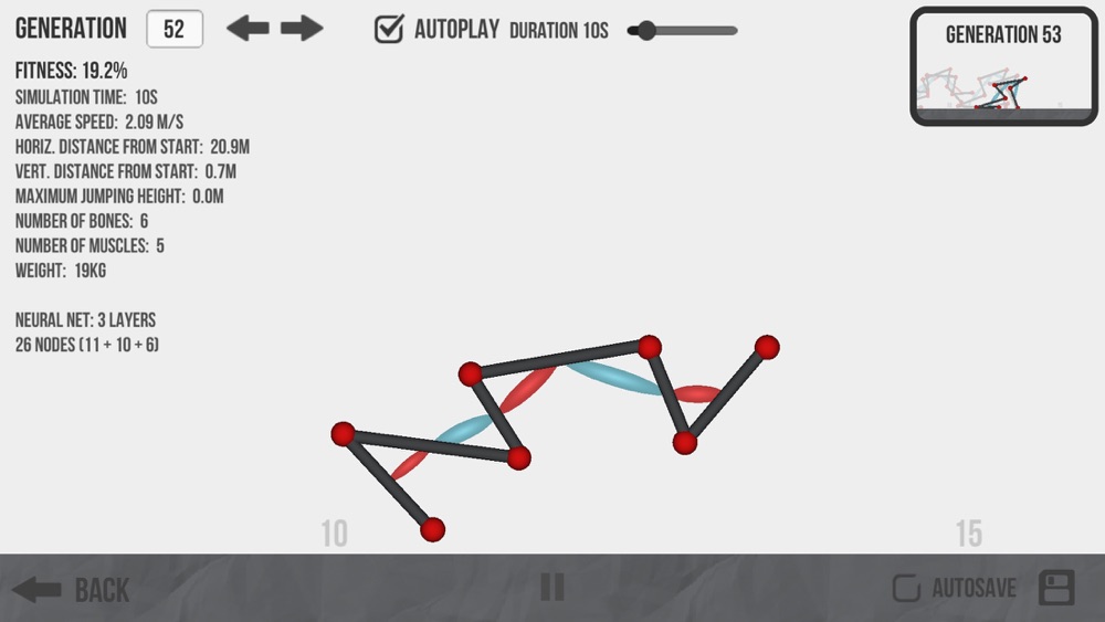 Use joints, bones and muscles to build creatures that are only limited by your imagination. Watch how the combination of neural networks and an evolutionary algorithm can enable your creatures to learn and improve at their given tasks all on their own.