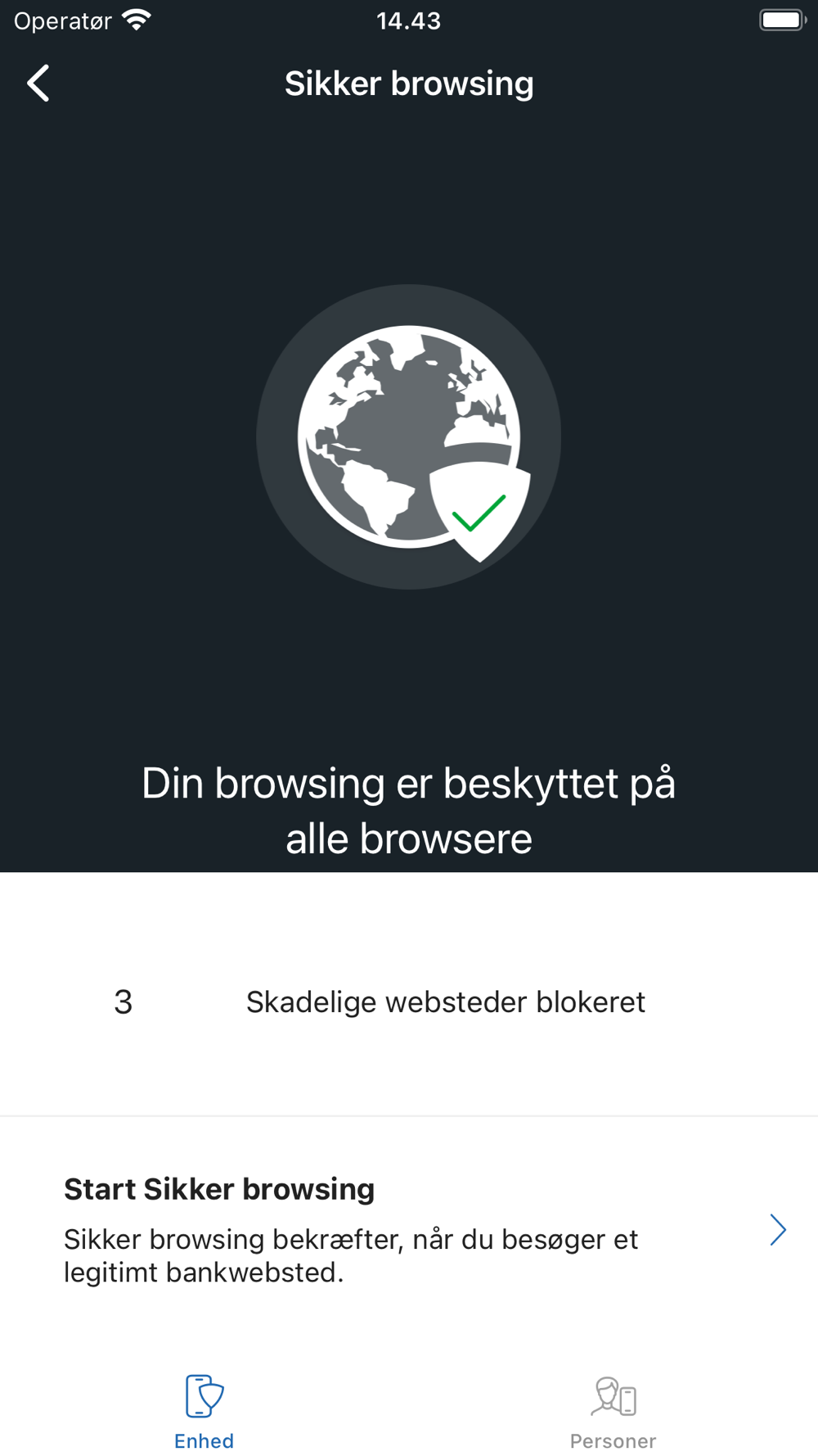 Sørger for din sikkerhed og beskytter personlige oplysninger ved at holde dig væk fra websteder, der spreder skadeligt indhold eller indsamler personlige oplysninger. Hvis du for eksempel har en ubeskyttet browser, kan du komme til at åbne et link, der sender dig til et falsk bankwebsted. Funktionen indeholder også netbankbeskyttelse, der fortæller dig, at det er et sikkert bankwebsted, og sikrer din forbindelse til webstedet.