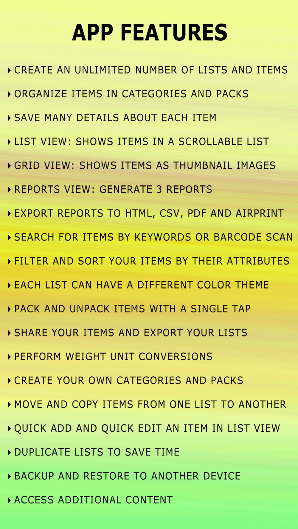 -Create your own Gear Lists, and group them by categories and separate them into packs.
