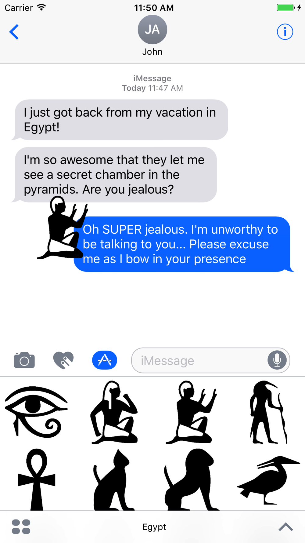 This sticker pack of Egyptian Hieroglyphics is a great way to include an ancient and mysterious culture in your conversations. Show off your knowledge with stickers like the Eye of Horus and the Egyptian God Thoth or get sassy with stickers like the Praying Man!