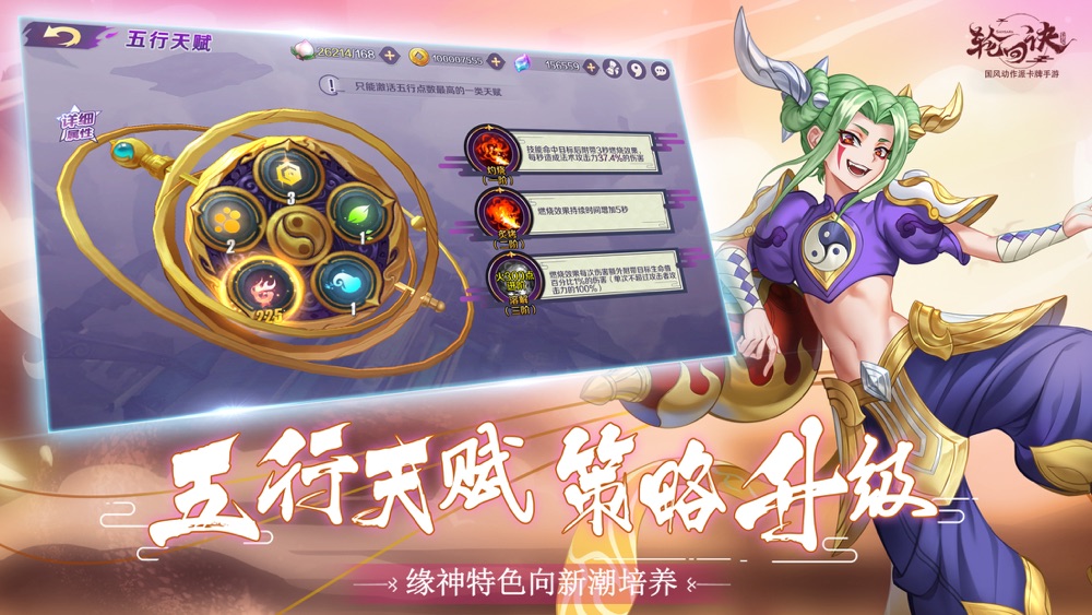 彰显缘神特色的五行天赋,为您的缘神如虎添翼。五行天赋丰富了契约系统,并增添了战斗的策略成分。每一个五行天赋的强弱都来自于契约点数累积的五行点数的数量决定,同时当五行点数达到一定数值时,还会开启效果更强的第二和第三效果。