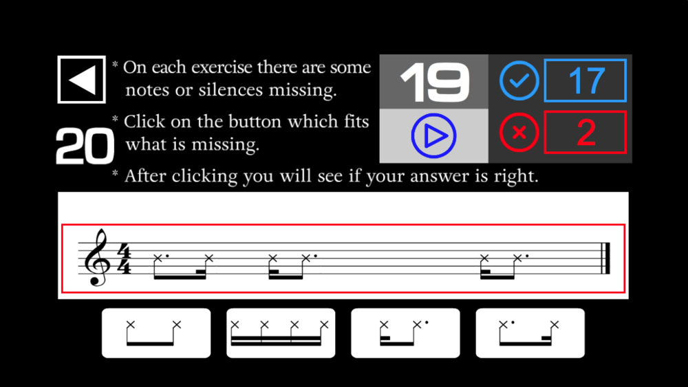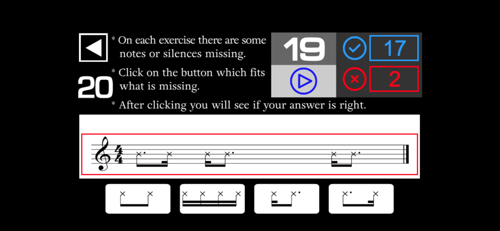 - On each exercise there are some notes or silences missing in the music sheet. You have to listen and click on the button which fits what is missing in the music sheet.