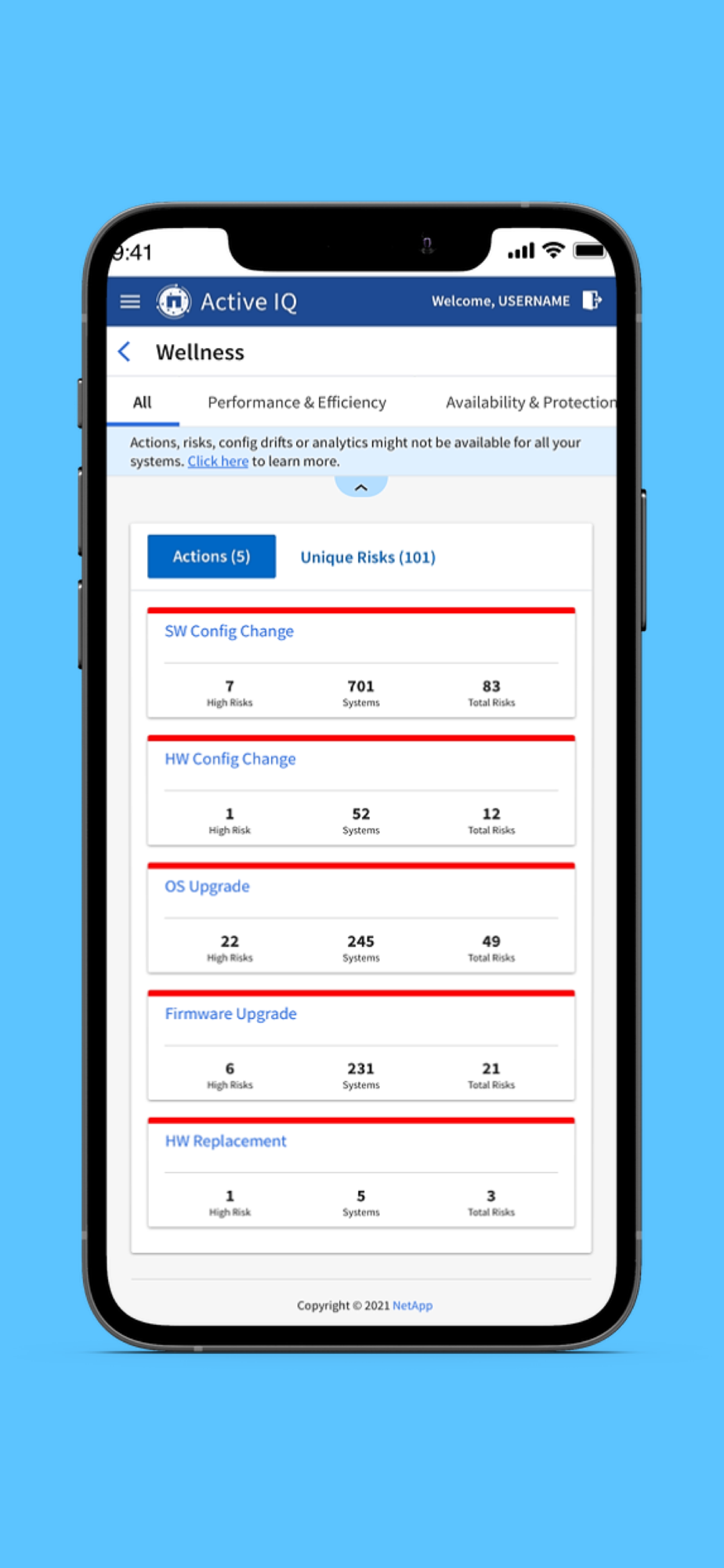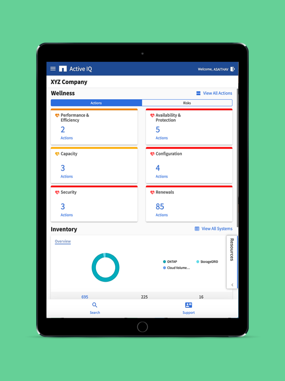 NetApp Active IQ is a digital advisor that simplifies the proactive care and optimization of NetApp storage. Fuelled by telemetry data from our highly diverse installed base, it uses advanced AI and ML techniques to uncover opportunities to reduce risk and improve the performance and efficiency of your storage environment. It then provides the prescriptive guidance and actions to make it happen. This “actionable intelligence” simplifies storage administration and leads to higher availability, improved security, and higher-performing storage.