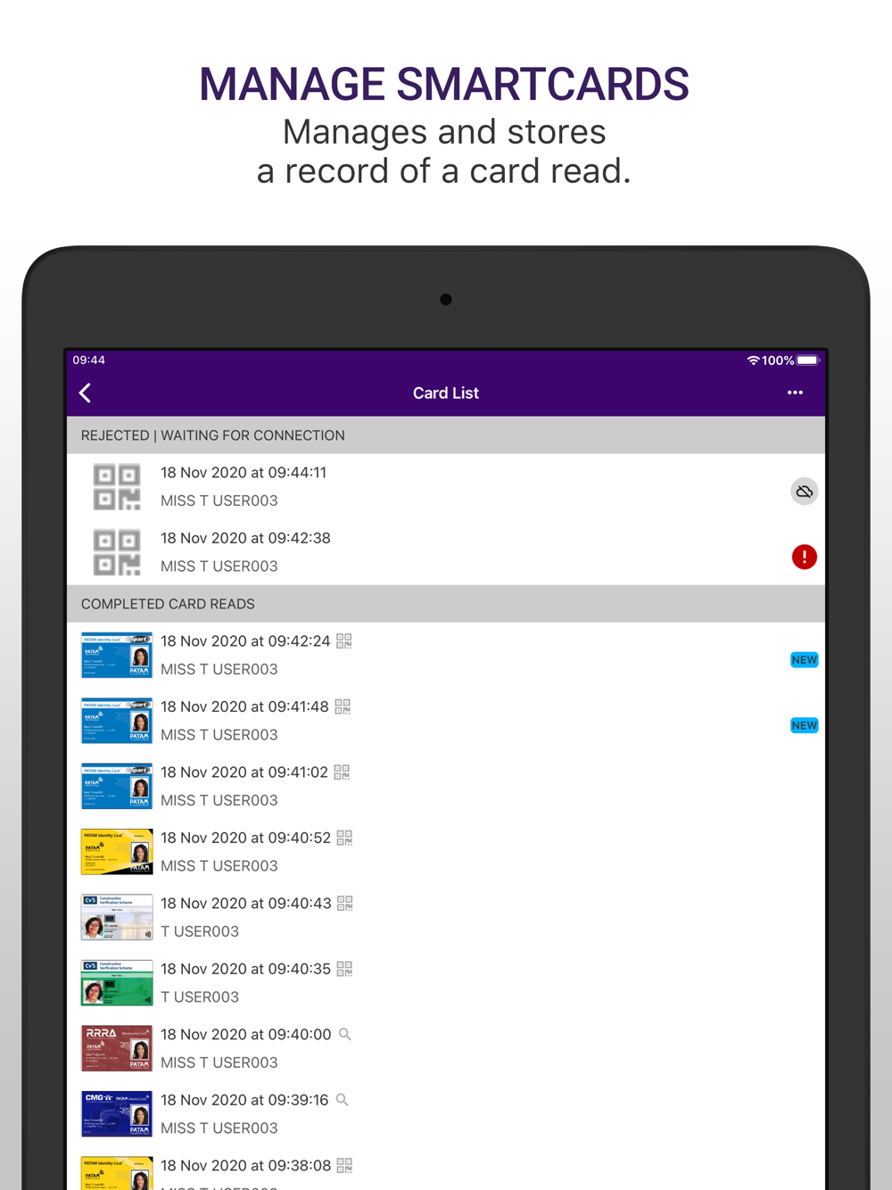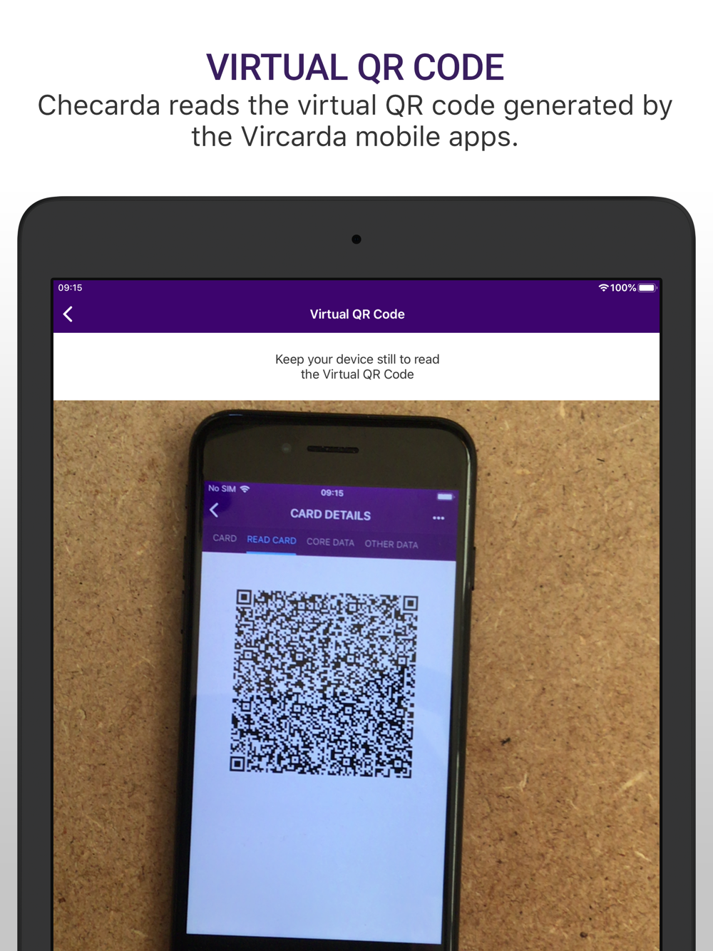 Checarda has the capability to read and check a cardholder's details using NFC enabled iOS smartphones or tablets or via a device's camera. The device reads information either directly from the physical smartcard's chip or from the QR code generated by the virtual smartcard.