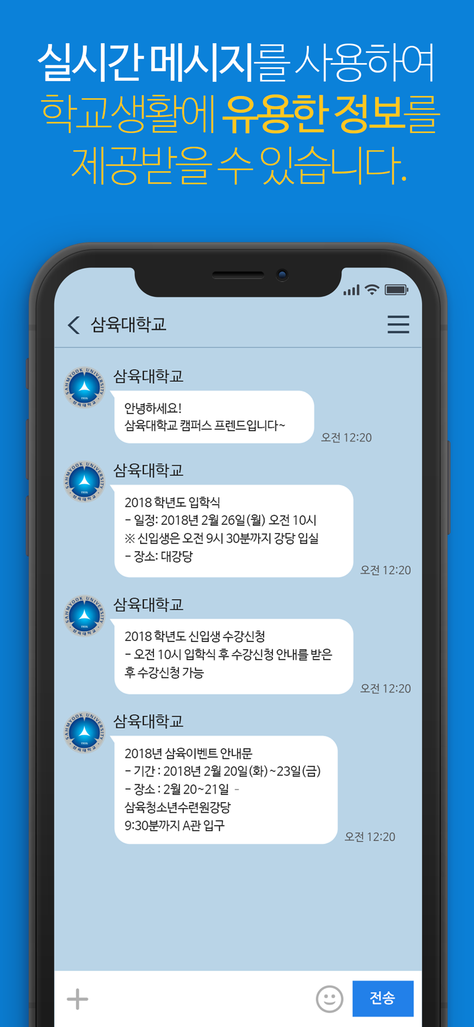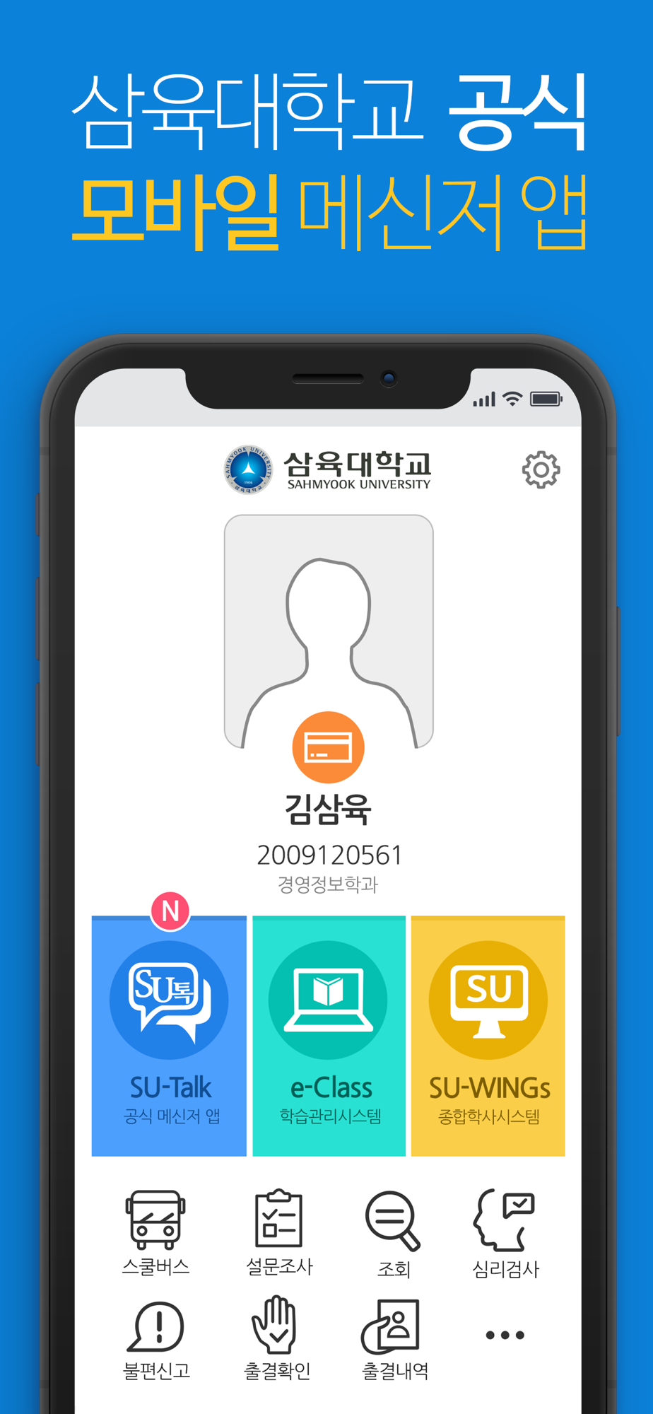 커뮤니케이션 기능이 강화된 삼육대학교 SU-Talk을 설치하시면 구성원간에 무제한 실시간 메시지를 사용하여 학교생활에 유용한 정보를 제공받을 수 있습니다.