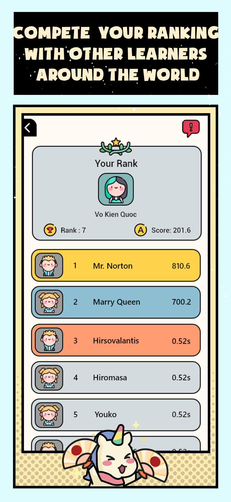 Challenge multiple choice questions within the time-limit. Results come out as a ranking among all learners around the world.