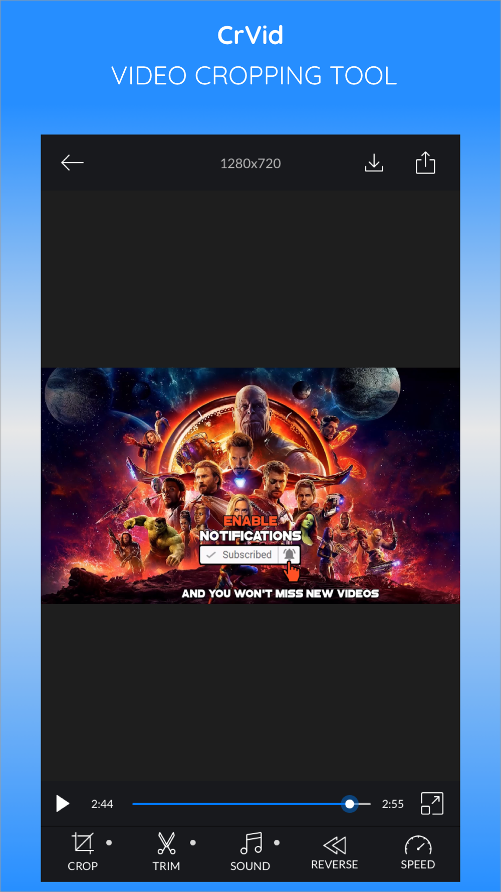 Just add your video to the app, resize and crop your video with a pinch of your fingers, save it to the camera roll or share it on other apps, Facebook, Instagram, Email,...