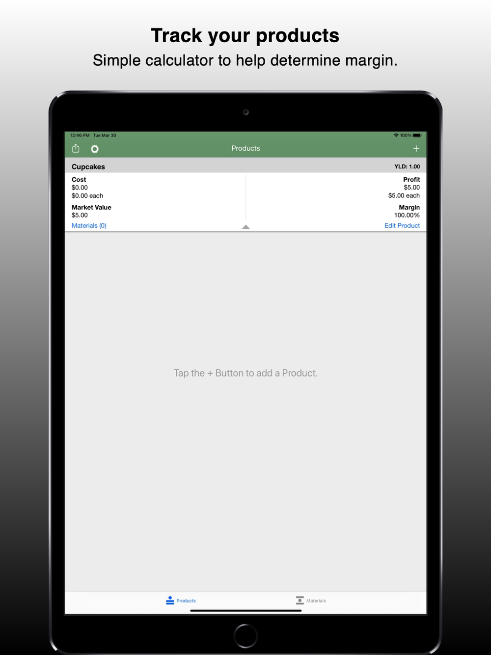 * Products - See all of your products at a glance on the main screen. Instantly see what products are profitable and margins. Will the product be profitable and by how much? Changing material quantities immediately is reflected in your profit so you know how a change in a material or expense cost will affect your bottom line.