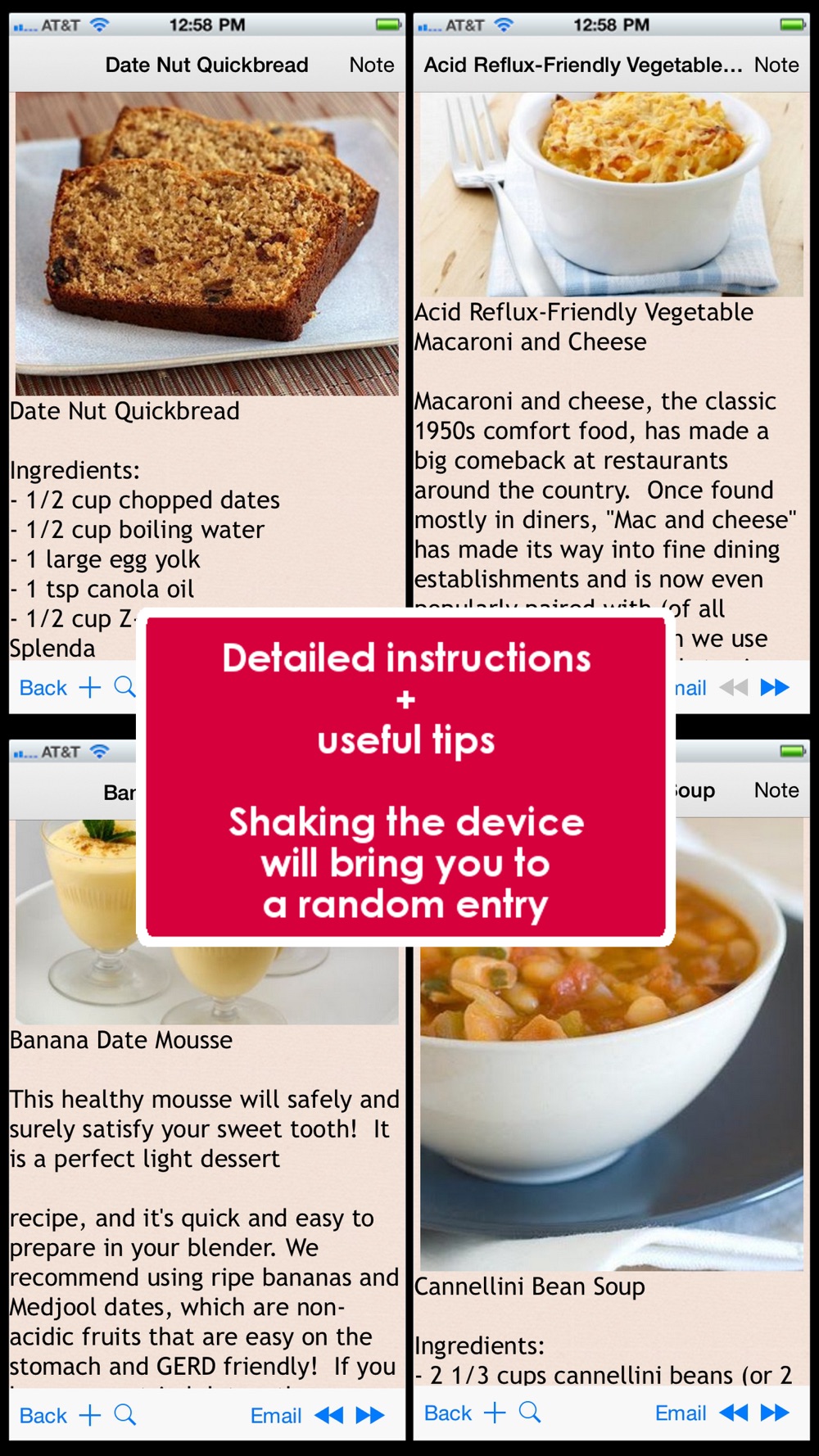 350 GERD Diet Recipes Recipes is an application containing over 350 detailed cooking recipes that are suitable for GERD patients. For each recipe included in this App, a photo, an ingredient list, a step by step cooking direction, and a detailed nutritional table is provided.