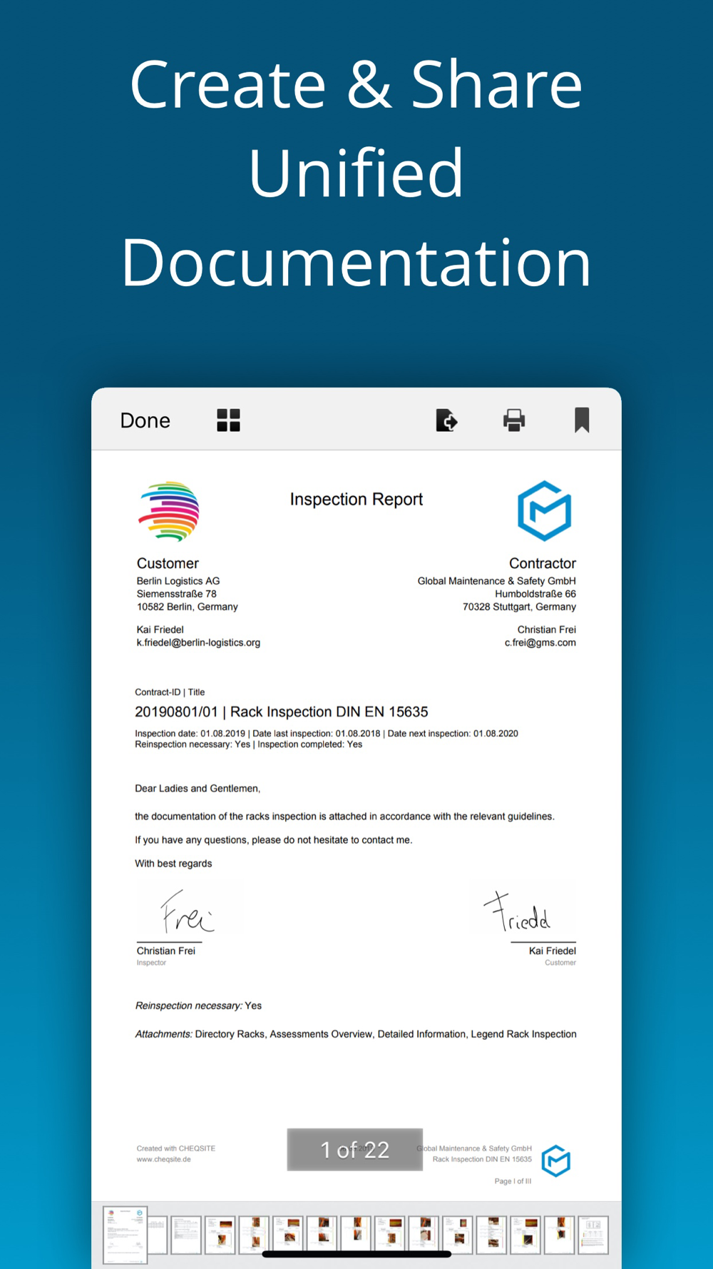 At the end of the process, you create uniform reports and easily share them with your customers and partners, e.g. via cloud services or email. You can also export and backup all your inspection results and rack information at any time.