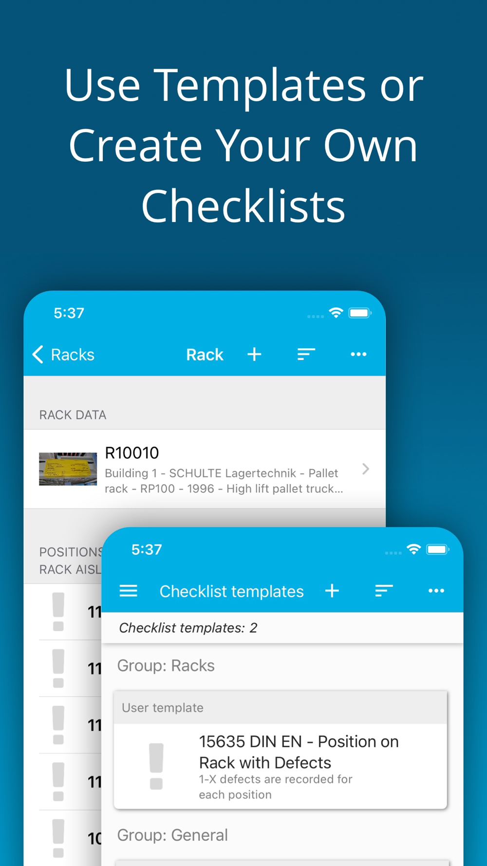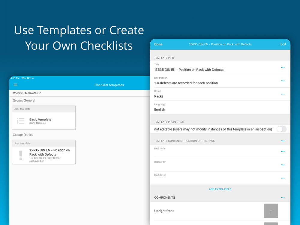 The CHEQSITE rack inspection application is a lean software solution for inspecting companies and self-employed professionals. With the app you inspect racking systems according to your national standard faster and more efficiently. You can use preinstalled templates for DIN EN 15635 or customize templates according to your specific needs as suggested by SN, SEMA, ANSI, RMI, etc.